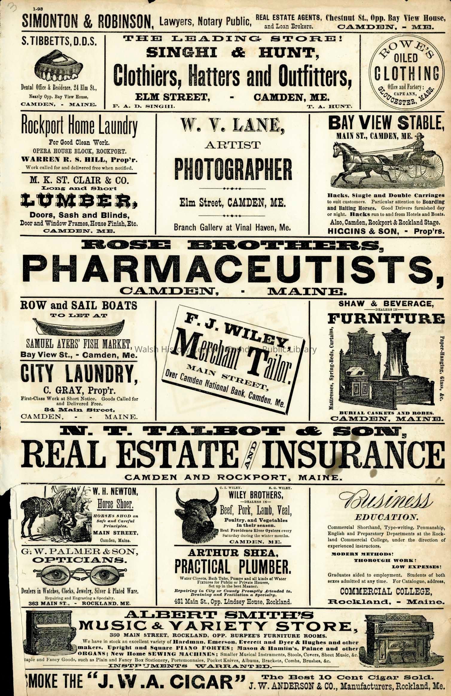 Bay View Stable, Camden, City Laundry, M. K. St. Clair & Company, Maine, N. T. Talbot & Son, Rockport Home Laundry, Rose Brothers, Pharmaceutists, S. Tibbetts, D.D.S., Samuel Ayers' Fish Market, Shaw & Beverage, Simonton & Robinson, Wiley Brothers
