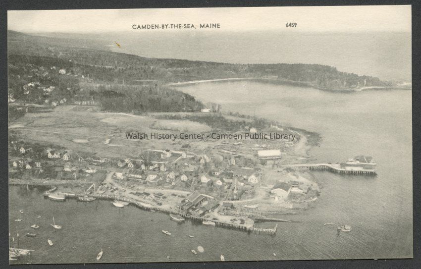 Aerial postcard view of the Camden shipyard and Sherman's Point. Card produced by the American Art Postcard Company of Boston and titled "Camden-By-The-Sea, Maine."Collection