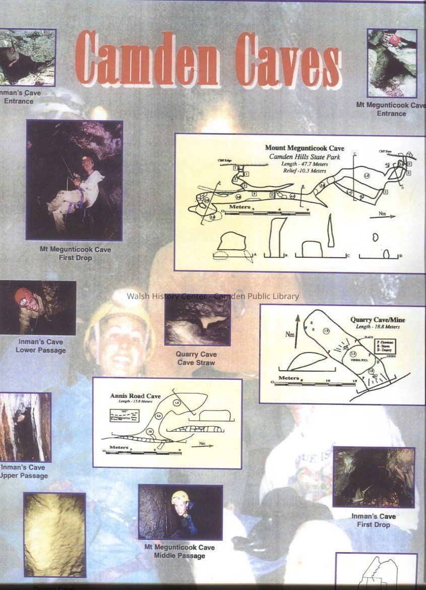 Colored poster of Camden caves including: Annis Road Cave, Bear Cave, Inman's Cave, Mt. Megunticook Cave, Megunticook Talus Cave, Quarry Cave/Mine, and Wawenock Cave.Collection