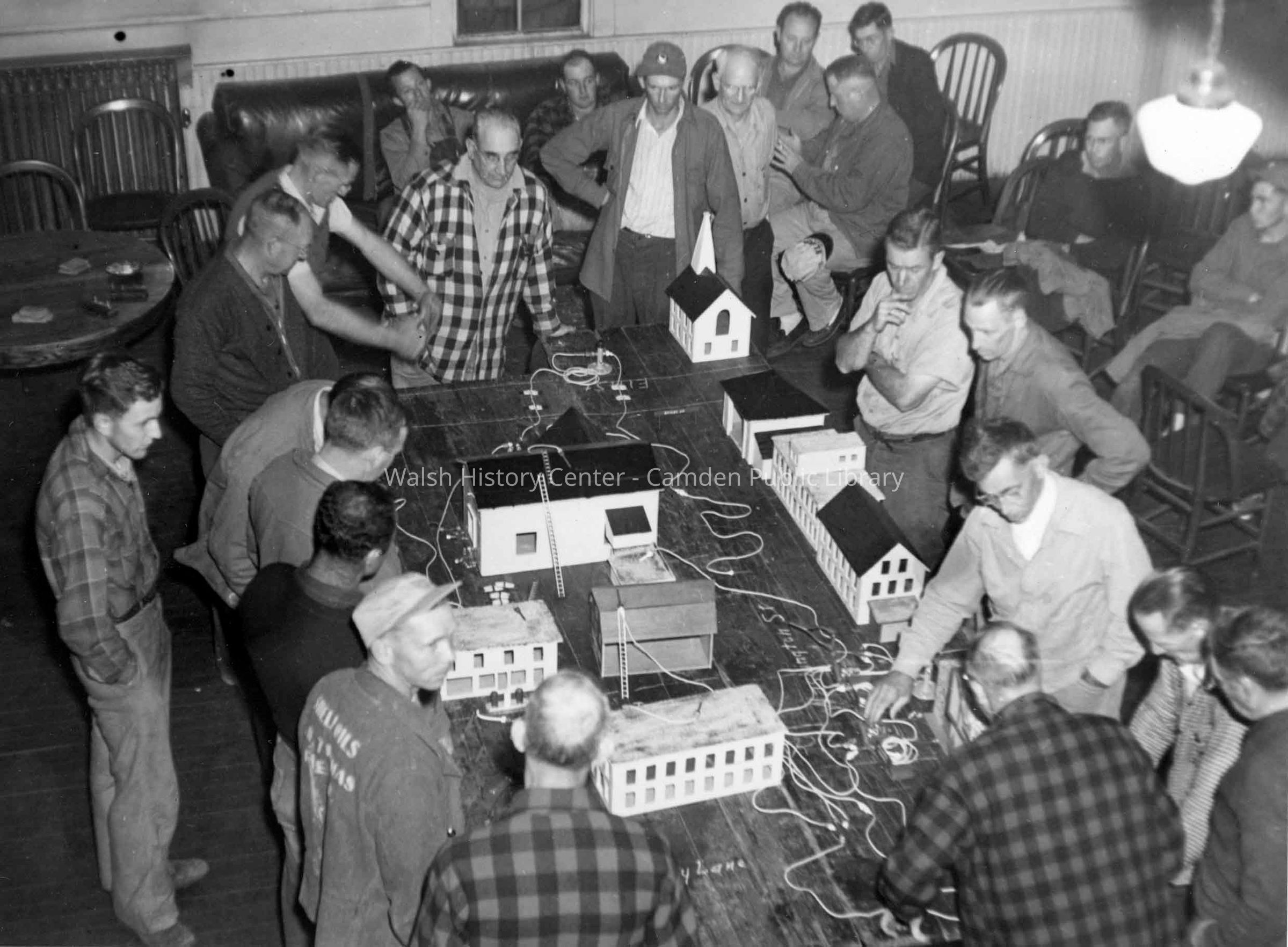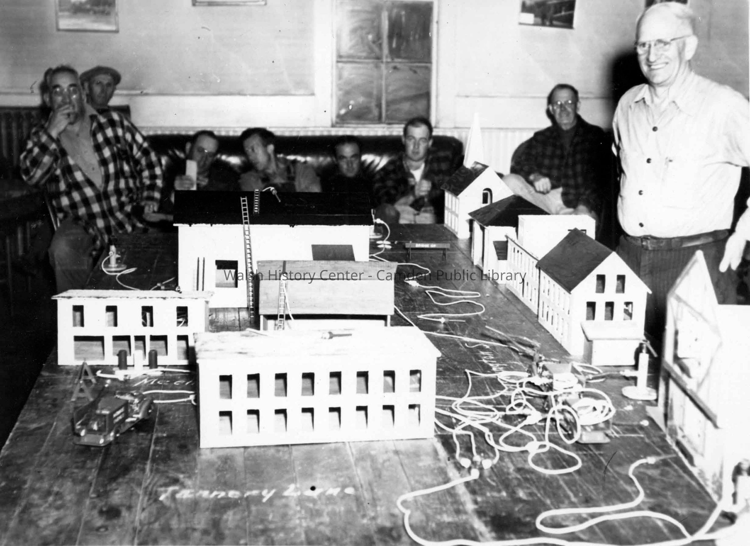 Two photographs (b/w) of Tannery Lane miniature replicas. Appears to be members of the Camden Fire Department look at model buildings. Several miniature ladders and hoses are next to the buildings. Fire Chief Allen Payson is present in both images.Collection
