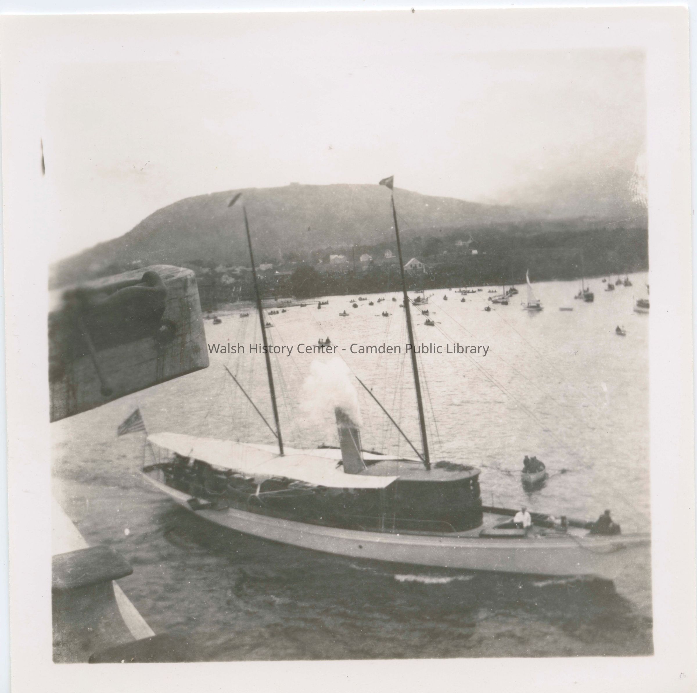 Black and white photograph from the deck of the George W. Wells on August 14, 1900. Photo shows large yacht in foreground. Smaller boats and Mt. Battie are visible in the background.Collection