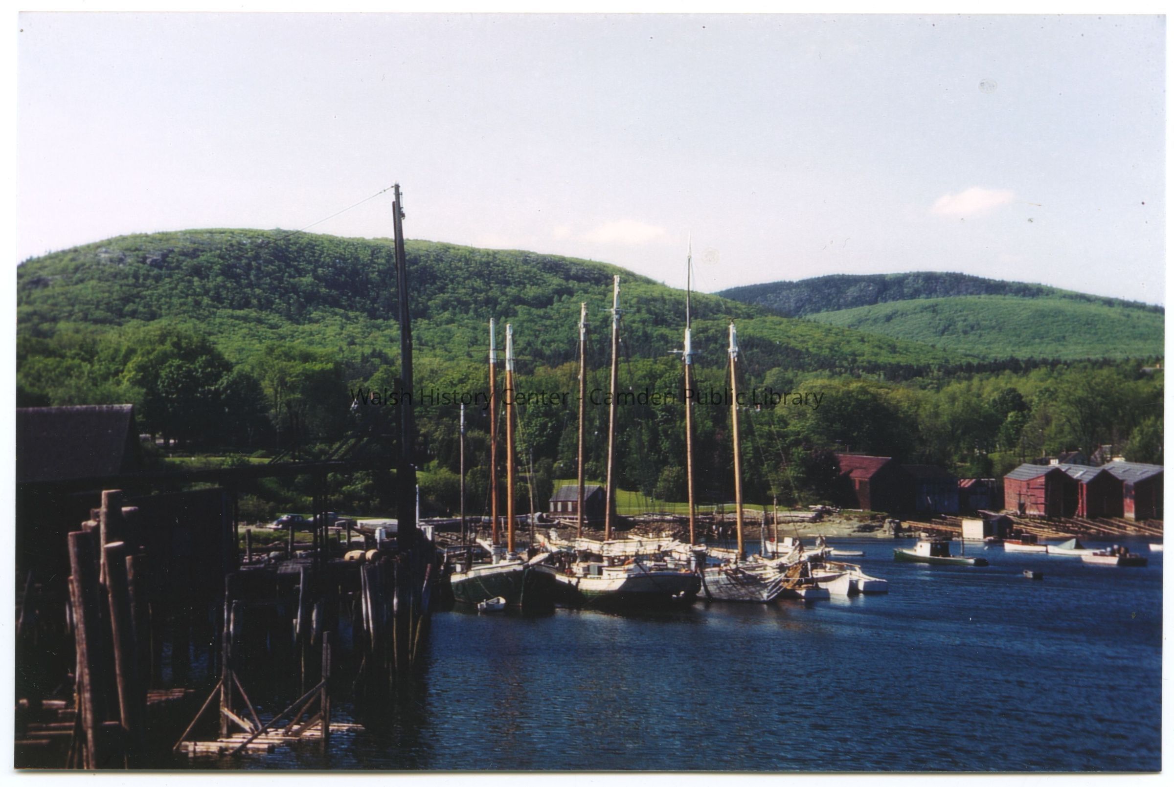 Color photograph of Camden harbor and the red boatbuilding sheds. Photograph printed from slides taken in 1930s.Collection