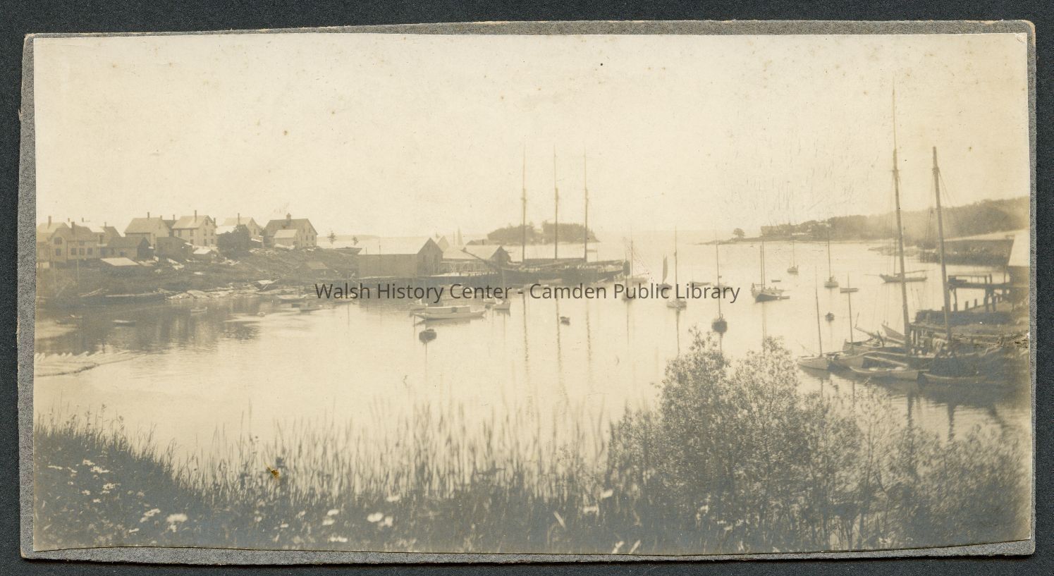 One 2 x 5" photograph of Camden harbor. Image was taken near Megunticook River waterfall. Visible are houses along Sea Street, Camden shipyard, Negro Island (renamed Curtis Island in 1934), Dillingham Point, and the waterfront along Bayview Street.Collection