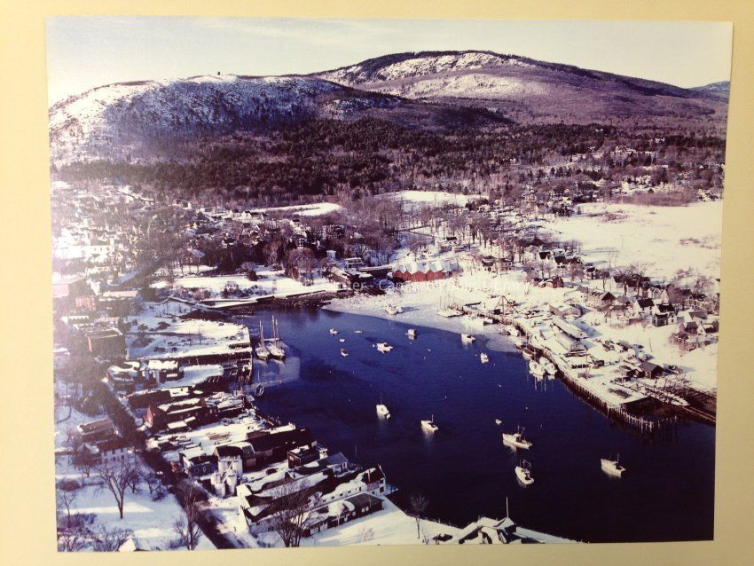 Aerial view of Camden Harbor, winter scene, color, c. 1950Collection