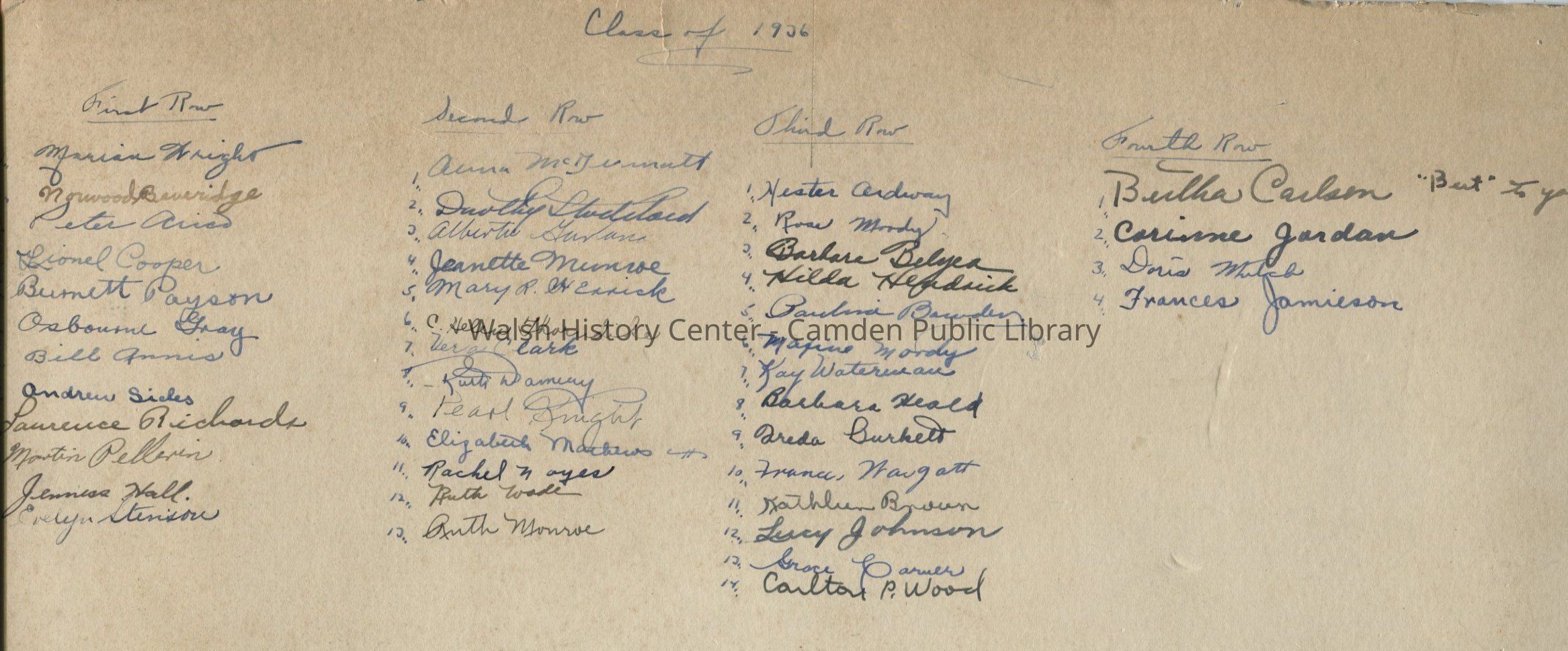 Photograph of the Camden High School graduating class of 1936. Classmates are identified on the back by row.Collection