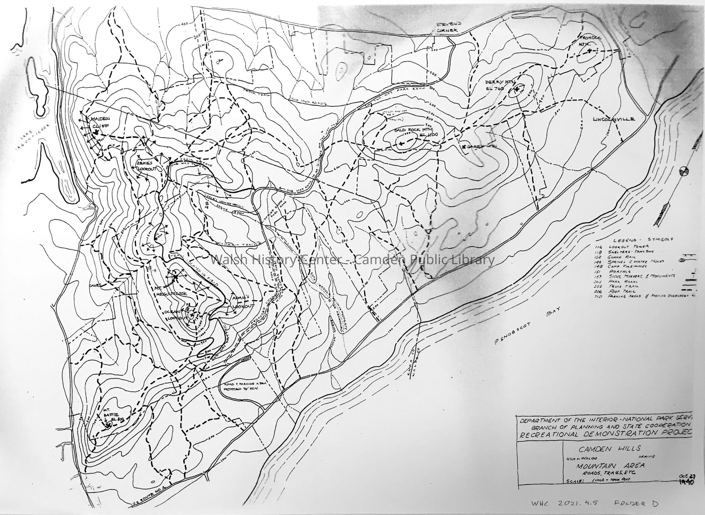 Camden Hills Mountain Area - Roads, Trails, etc. Knox-Waldo, Maine. Scale indicated; true scaling unknown, as this is a "photocopy of a photocopy," donated by Maura DiPrere of Camden Hills State Park. Dated October 27, 1940. Department of the Interior - National Park Service, Branch of Planning and State Cooperation, Recreational Demonstration Project.Collection
