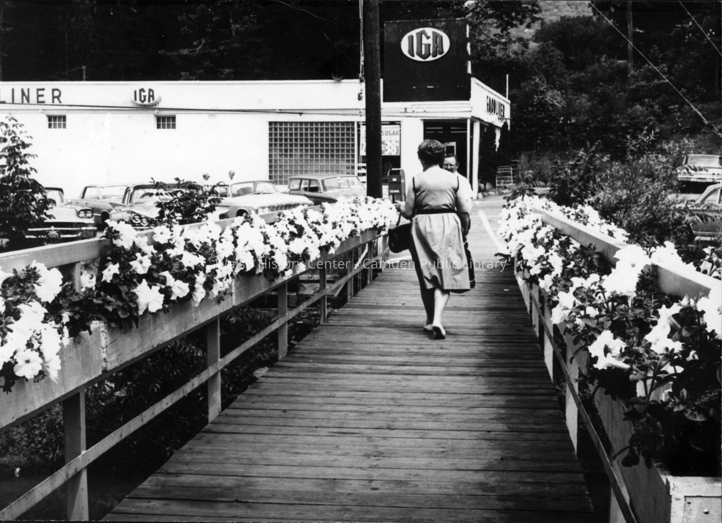 Photograph of a woman walking across the Megunticook River bridge to the IGA Foodliner located on Tannery Lane circa 1950.Collection