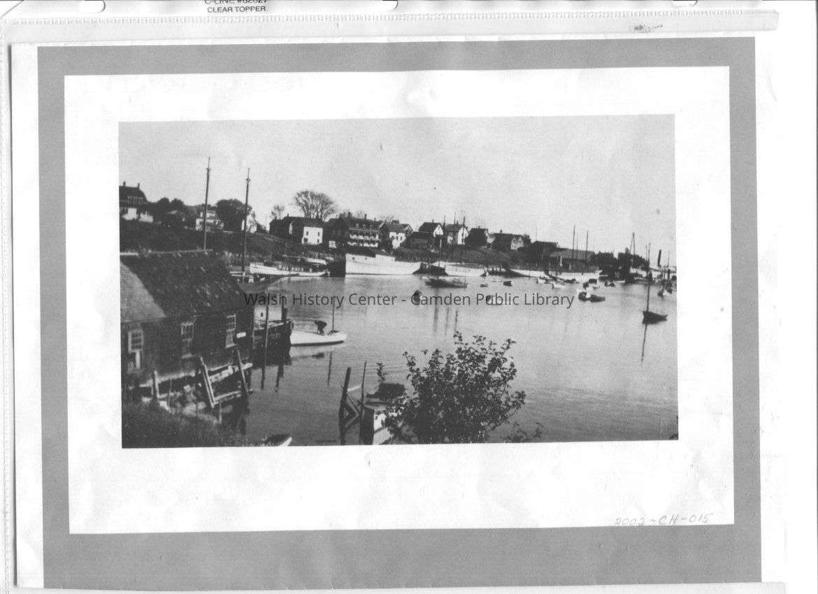 Black and white photographic print taken from a 1989 calendar. The image is of Camden's inner harbor viewed from the foot of what is now Harbor Park, looking across the harbor to Sea Street and the Robert Bean Shipyard.Collection