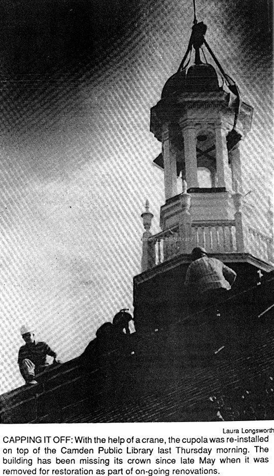 Photocopy of newspaper article with photo of cupola being re-installed on top of Camden Public Library.