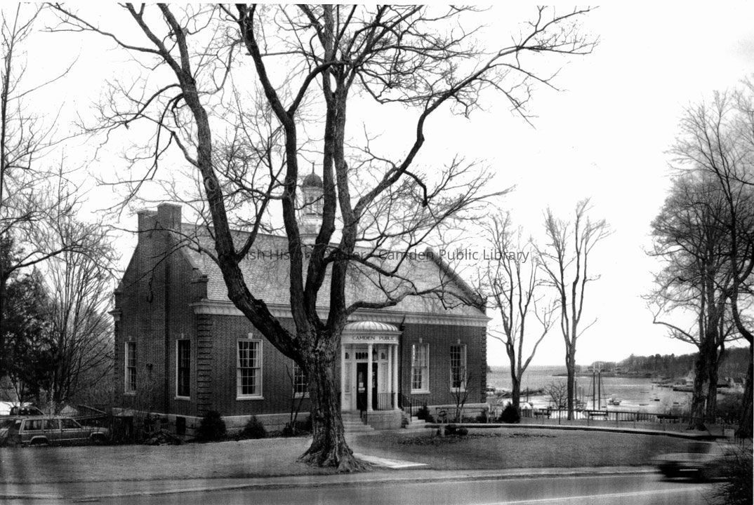 Scanned copy of black and white photogragh of Camden Public Libary before construction of addition. Front view with harbor in background.Collection