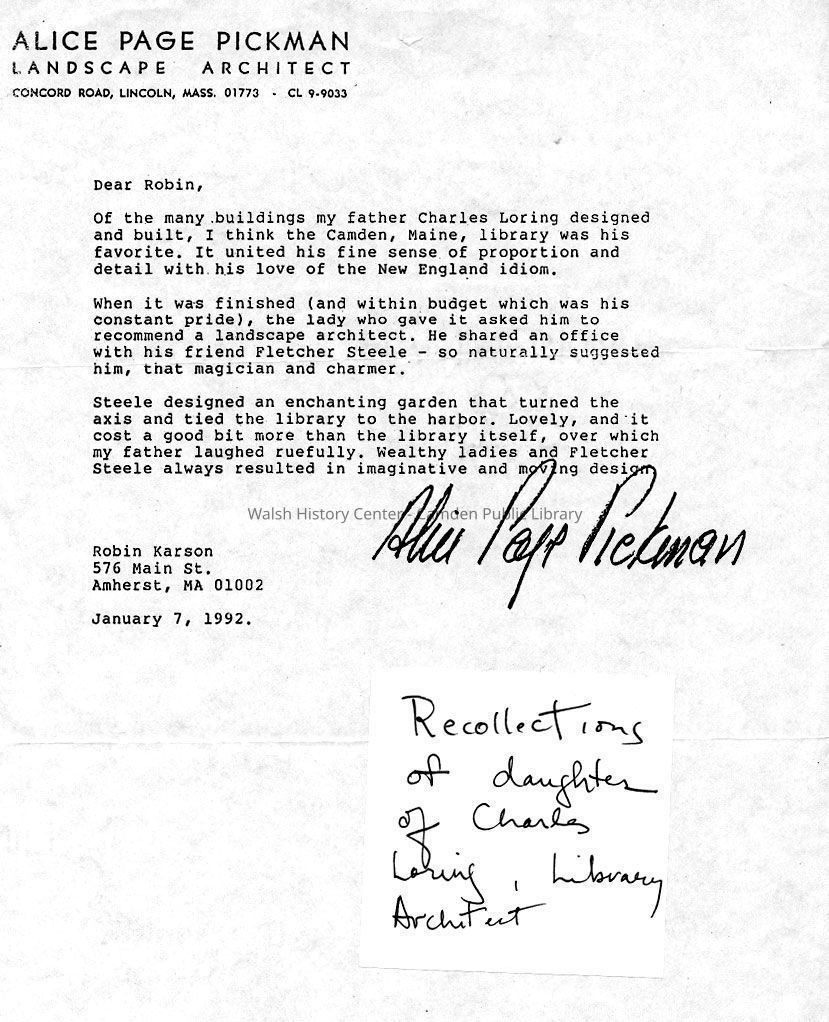 Photocopy of original letter to Robin Karson from Alice Page Pickman, daughter of Charles Loring, concerning her recollections of the library and Fletcher Steele.Collection