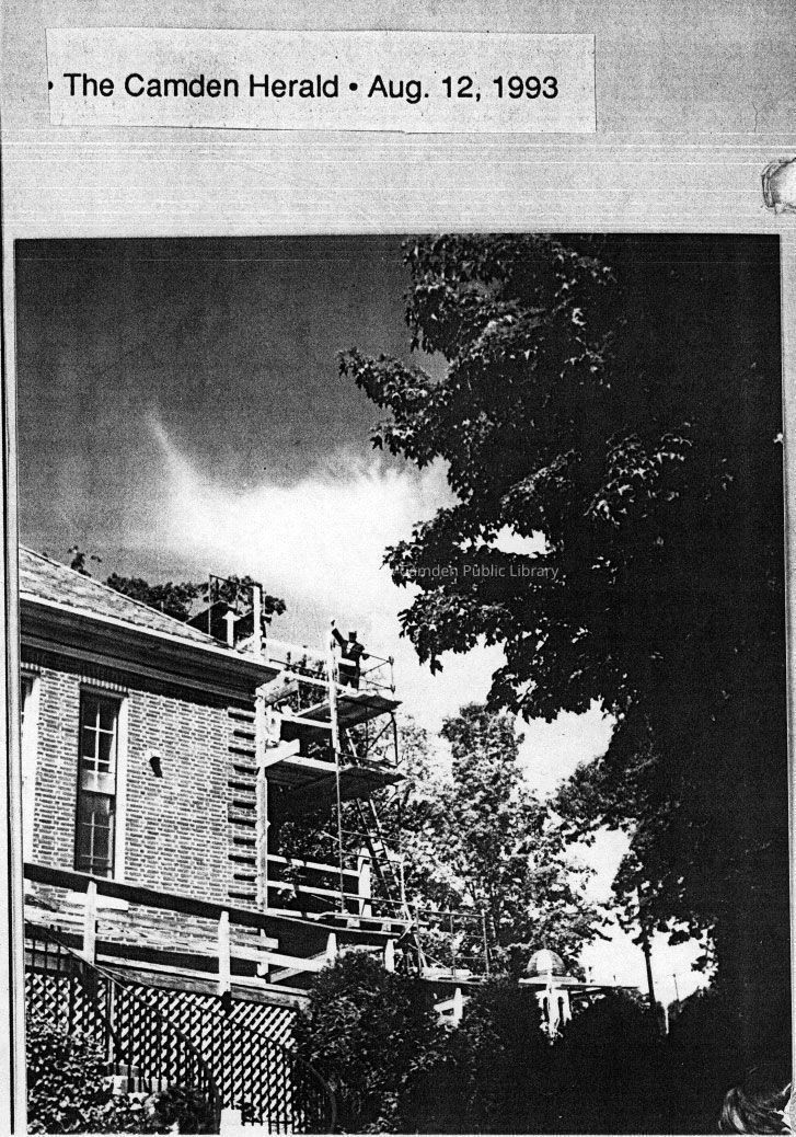 Photocopy of newspaper article including photo of repair work on the north end of the library.
