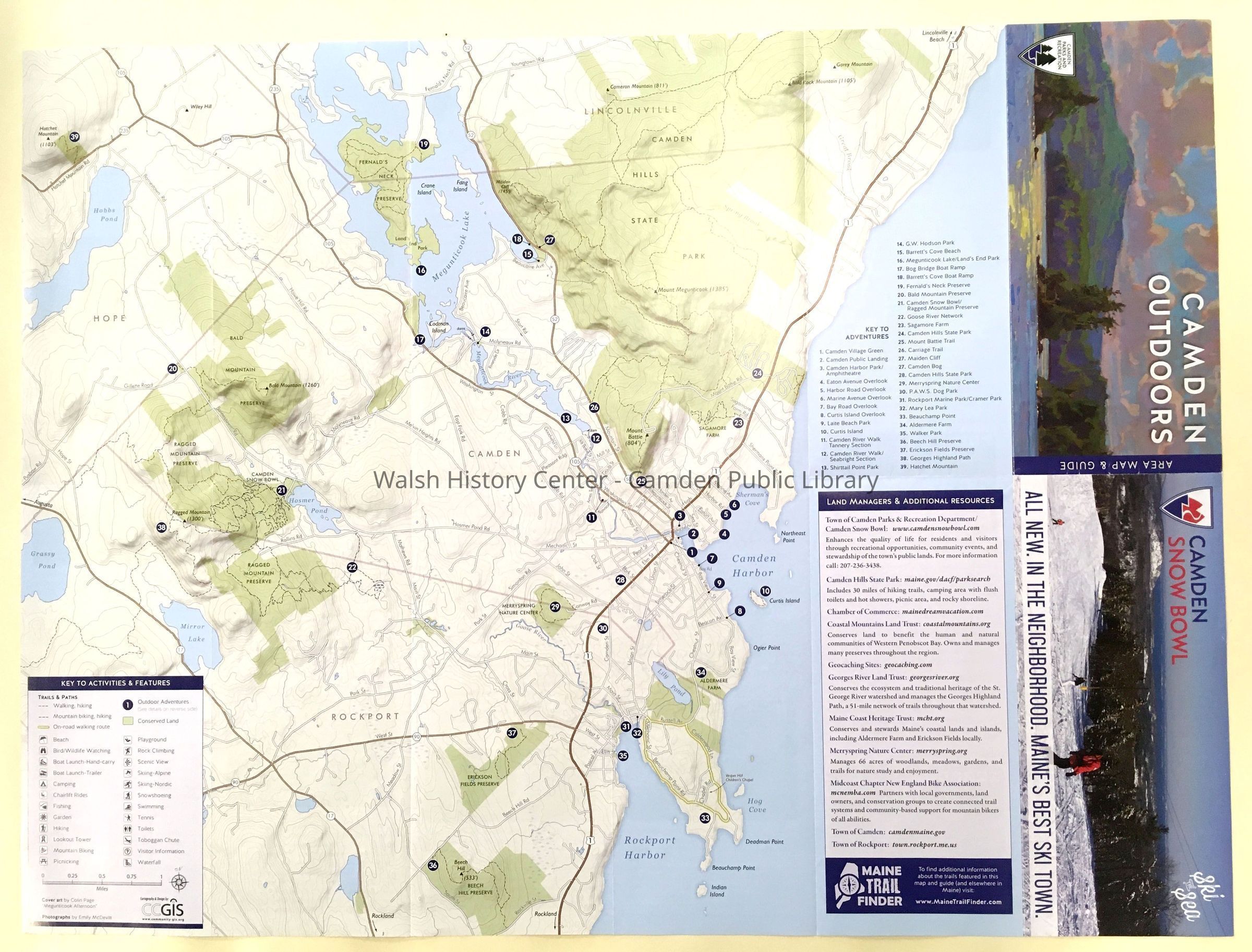 (two copies) CAMDEN. Camden Outdoors / Camden Snow Bowl. This color map is two-sided, folded in 12. Side One is the double title at the right side, the balance being filled with a topographic map of Camden and parts of adjacent towns, showing and naming local streets, numbered highways, and preserves. Mountain peaks and elevations are shown. Trails and ski trails are mapped. Thirty-nine locations of interest are indicated.