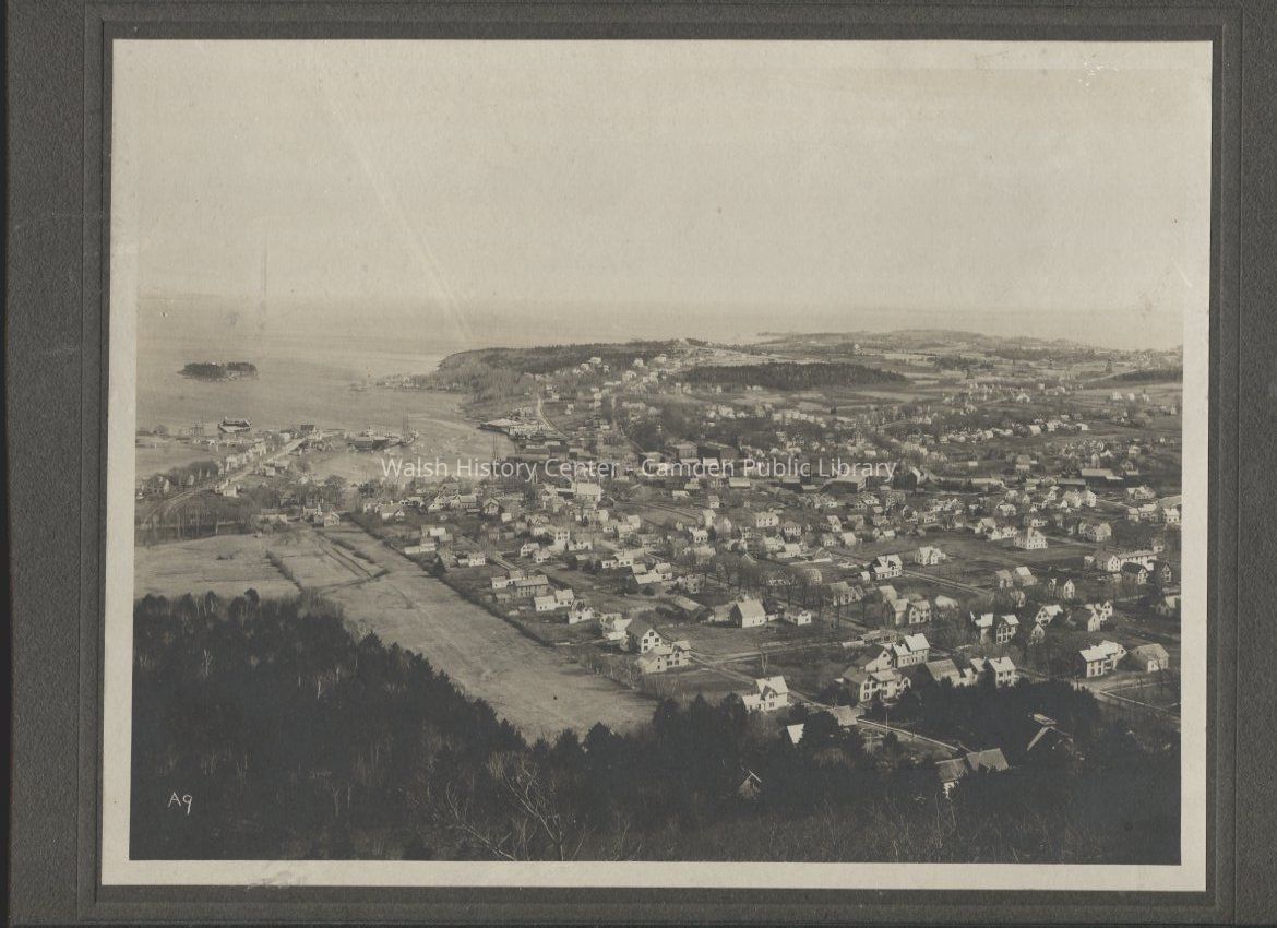 Sepia photograph of Camden and Rockport area as viewed from Mt. Battie. Photo is undated but is circa 1904 as the Ocean House hotel on the current Camden Public Library site is gone (burned in 1903) and the Camden Yacht Club has not yet been built.Collection
