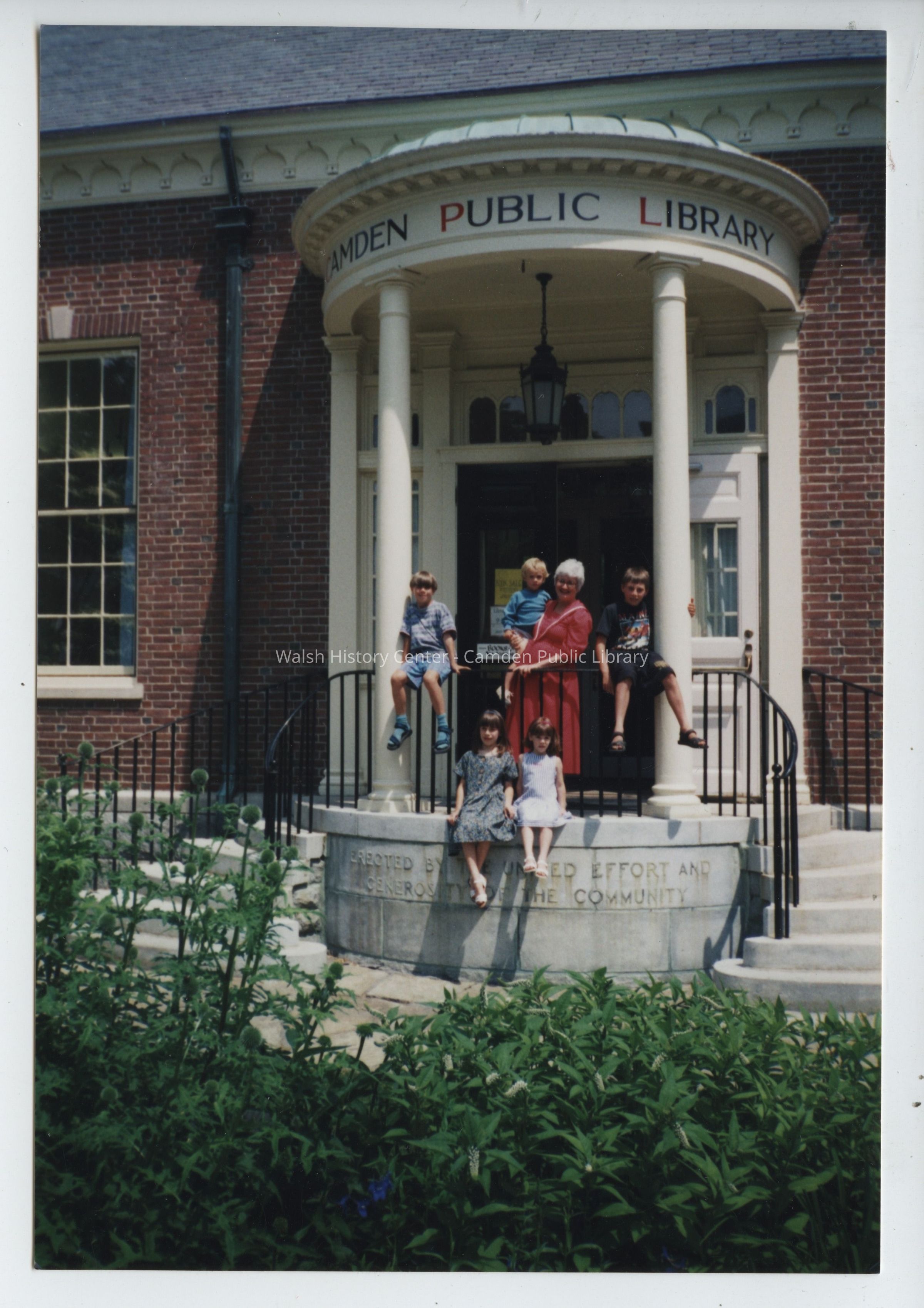 Photograph shows Camden Public Library director Elizabeth Moran with several children prior to the Centennial Wing expansion c.1994/1995.Collection