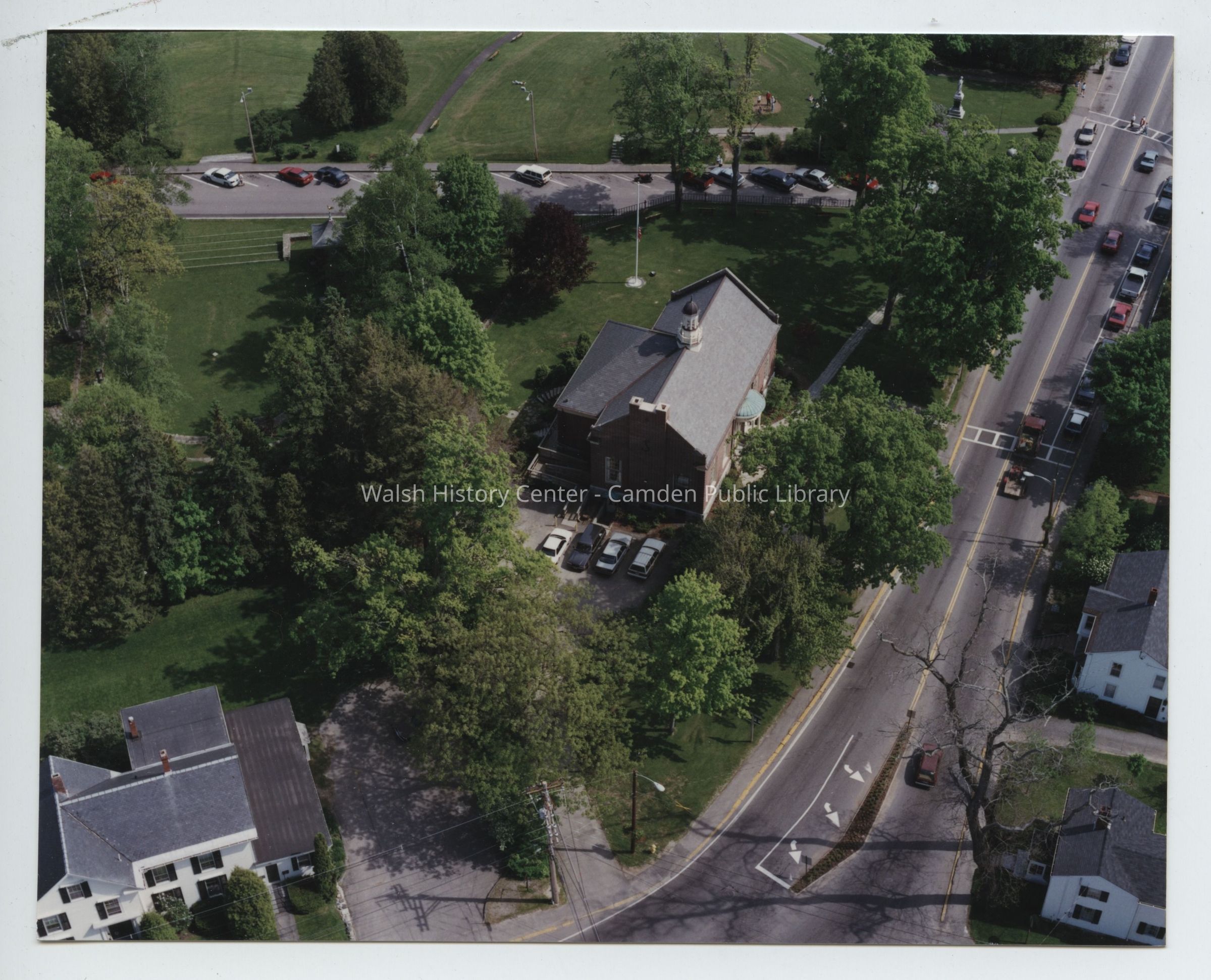 Aerial views of the Camden Public Library showing Atlantic Avenue, Main Street, High Street, Harbor Park and the Ampitheatre prior to the Centential Wing expansion c.1994/1995.Collection