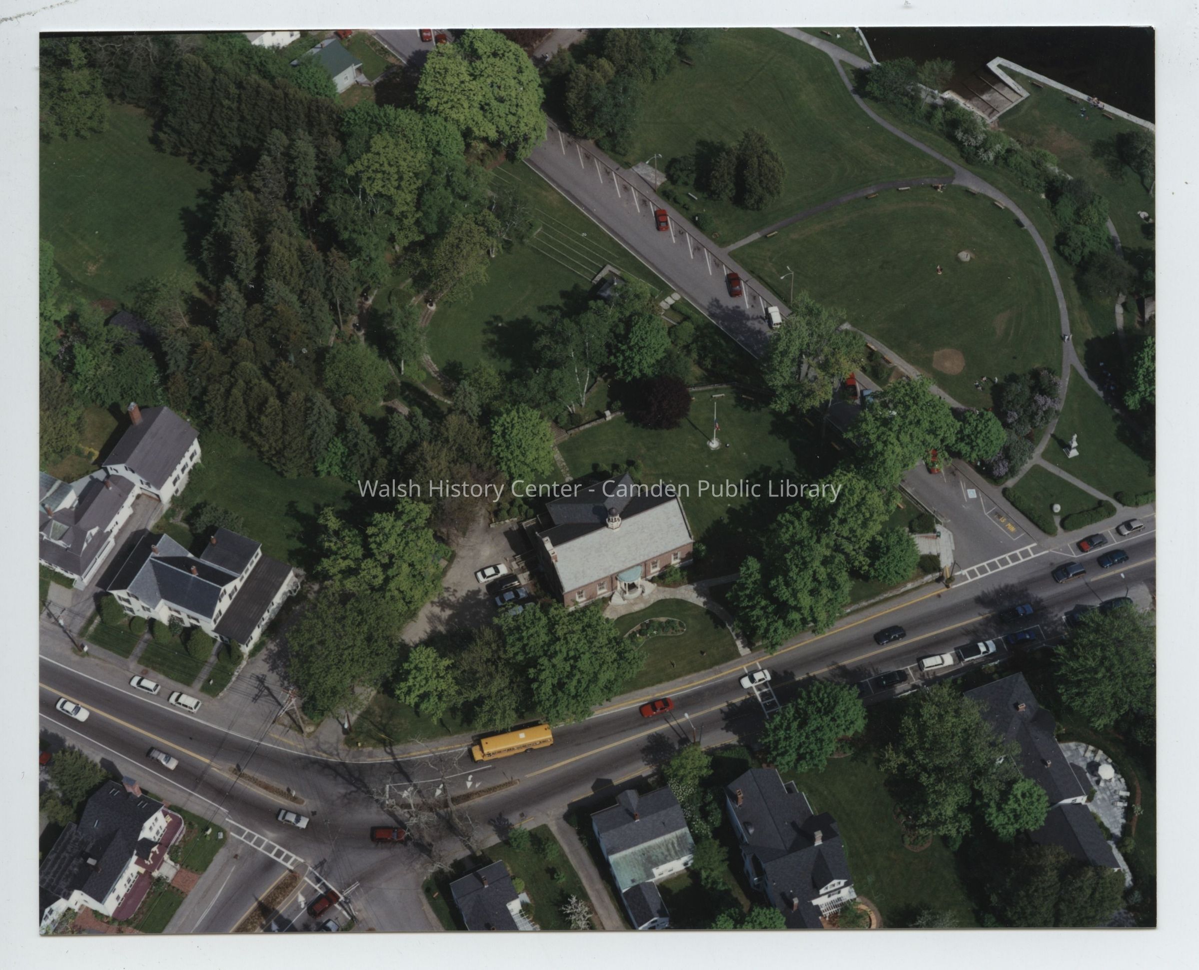 Aerial views of the Camden Public Library showing Atlantic Avenue, Main Street, High Street, Harbor Park and the Ampitheatre prior to the Centential Wing expansion c.1994/1995.Collection