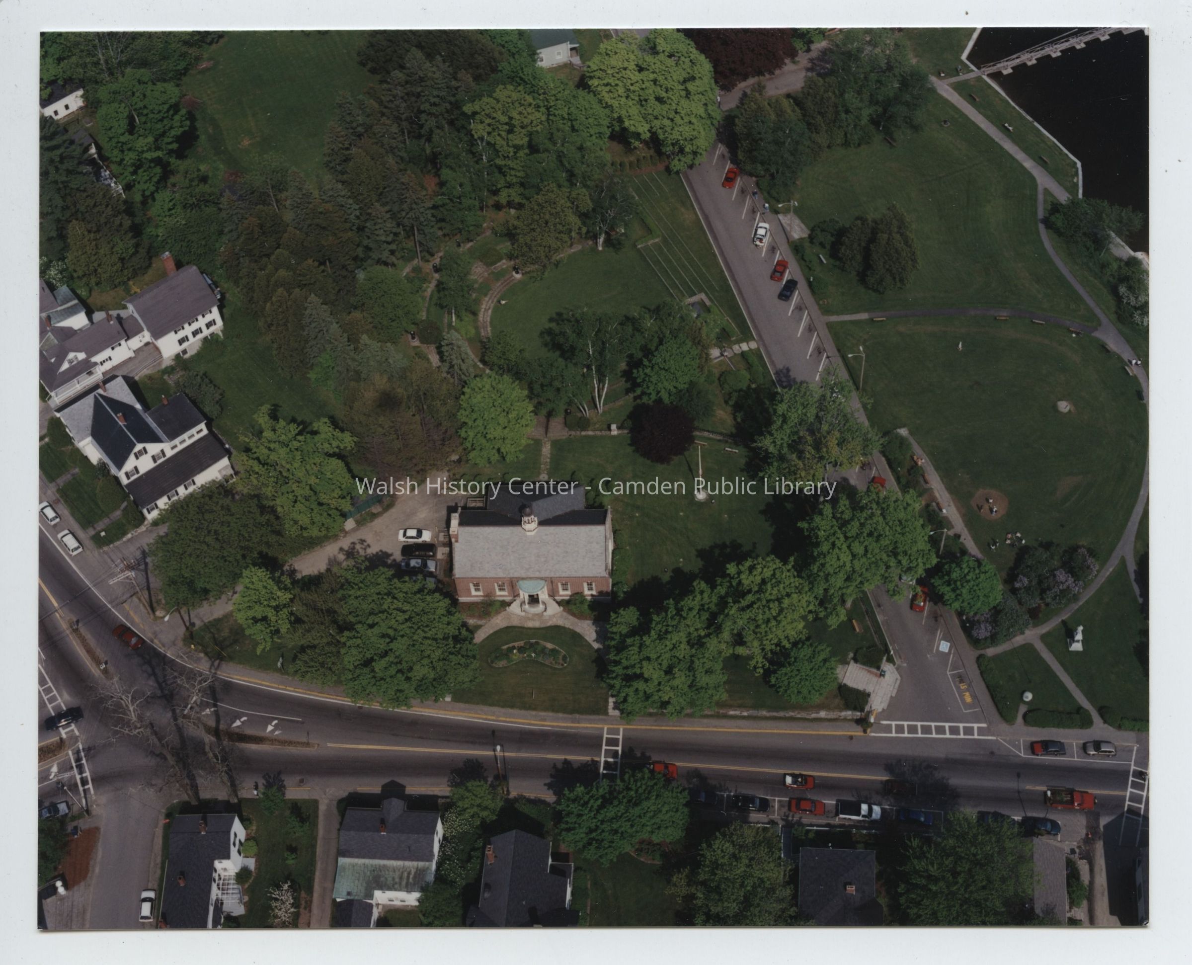 Aerial views of the Camden Public Library showing Atlantic Avenue, Main Street, High Street, Harbor Park and the Ampitheatre prior to the Centential Wing expansion c.1994/1995.Collection