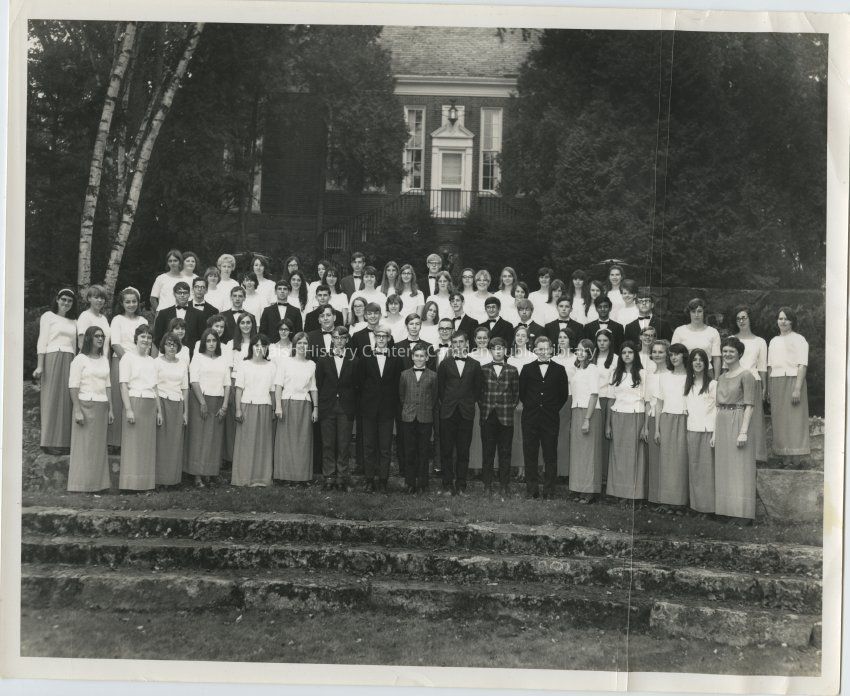 Black and white photograph of the Camden-Rockport High School chorus on the steps of the Amphitheatre in 1970. The chorus was led by music director Janice Parkinson standing at far right bottom row.Collection