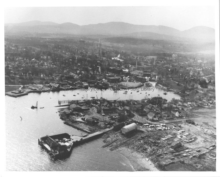 Black and white photograph of the Camden Shipbuilding & Marine Railway in 1946. The derelict Eastern Steamship wharf is in the foreground and the Camden hills in the background.Collection