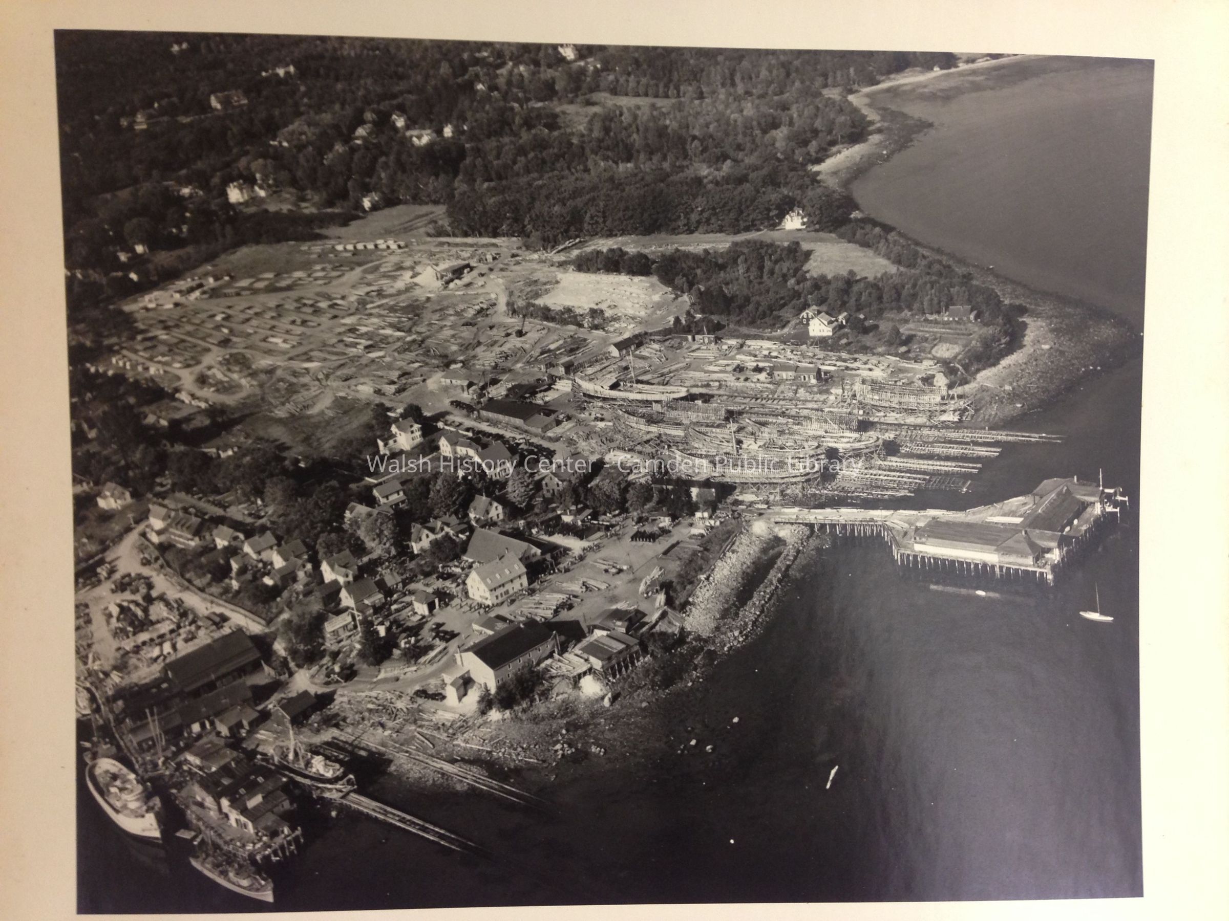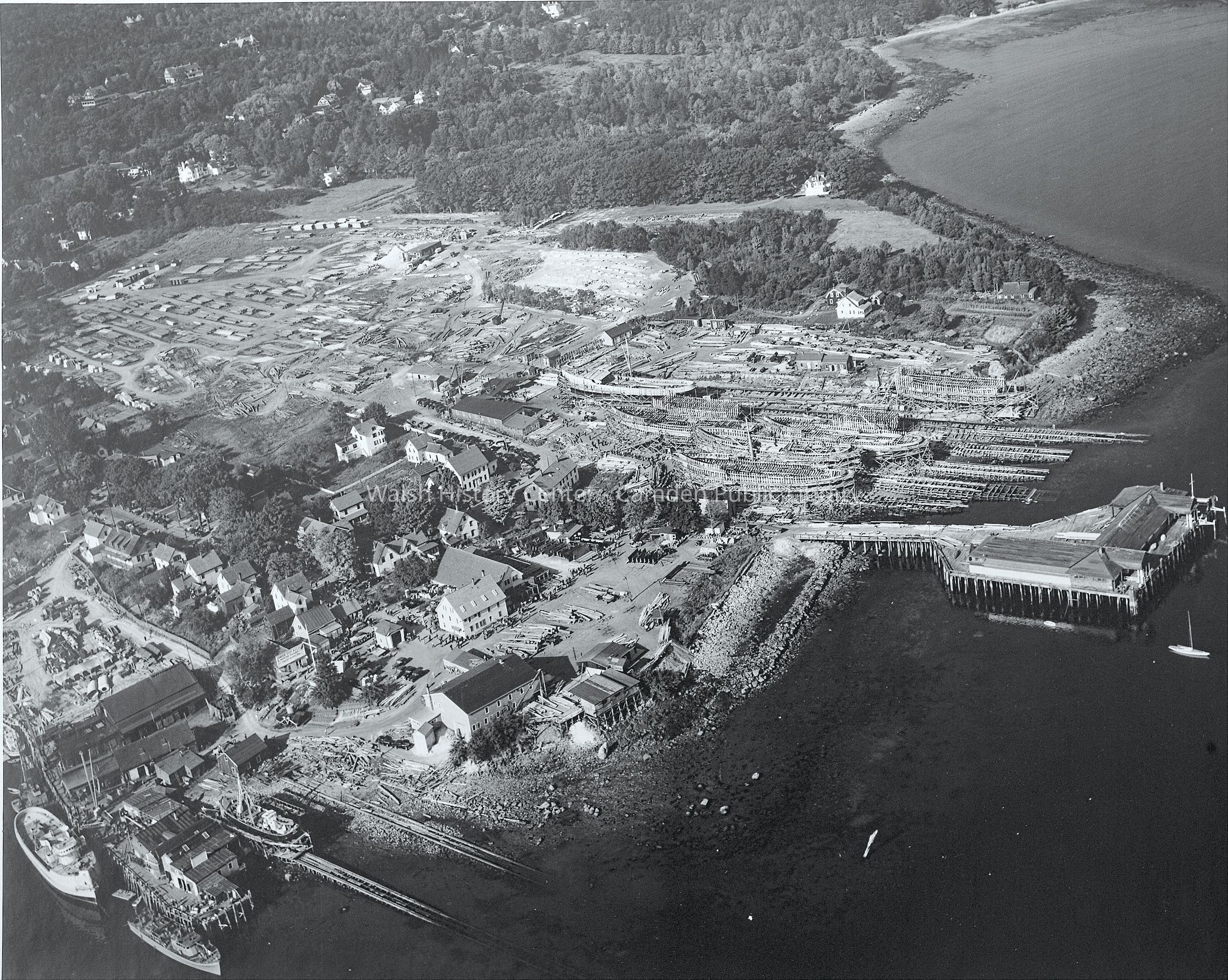 Photo of aerial view of the Camden shipyard with several vessels under construction.Collection