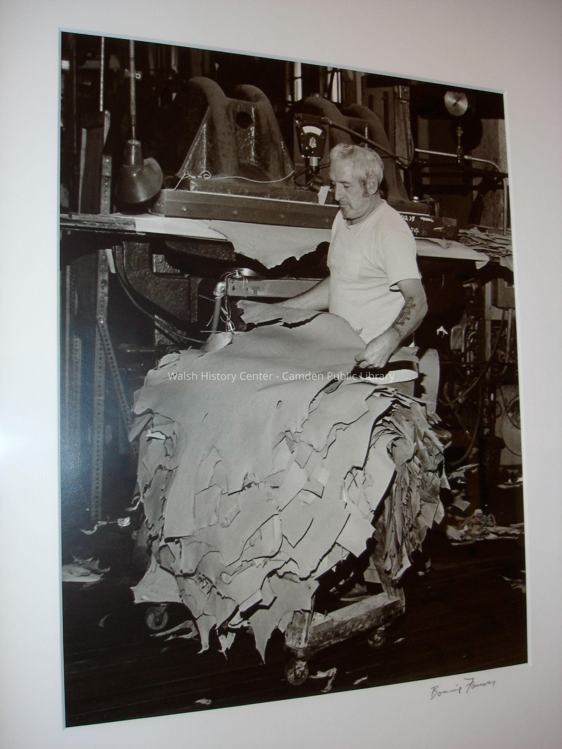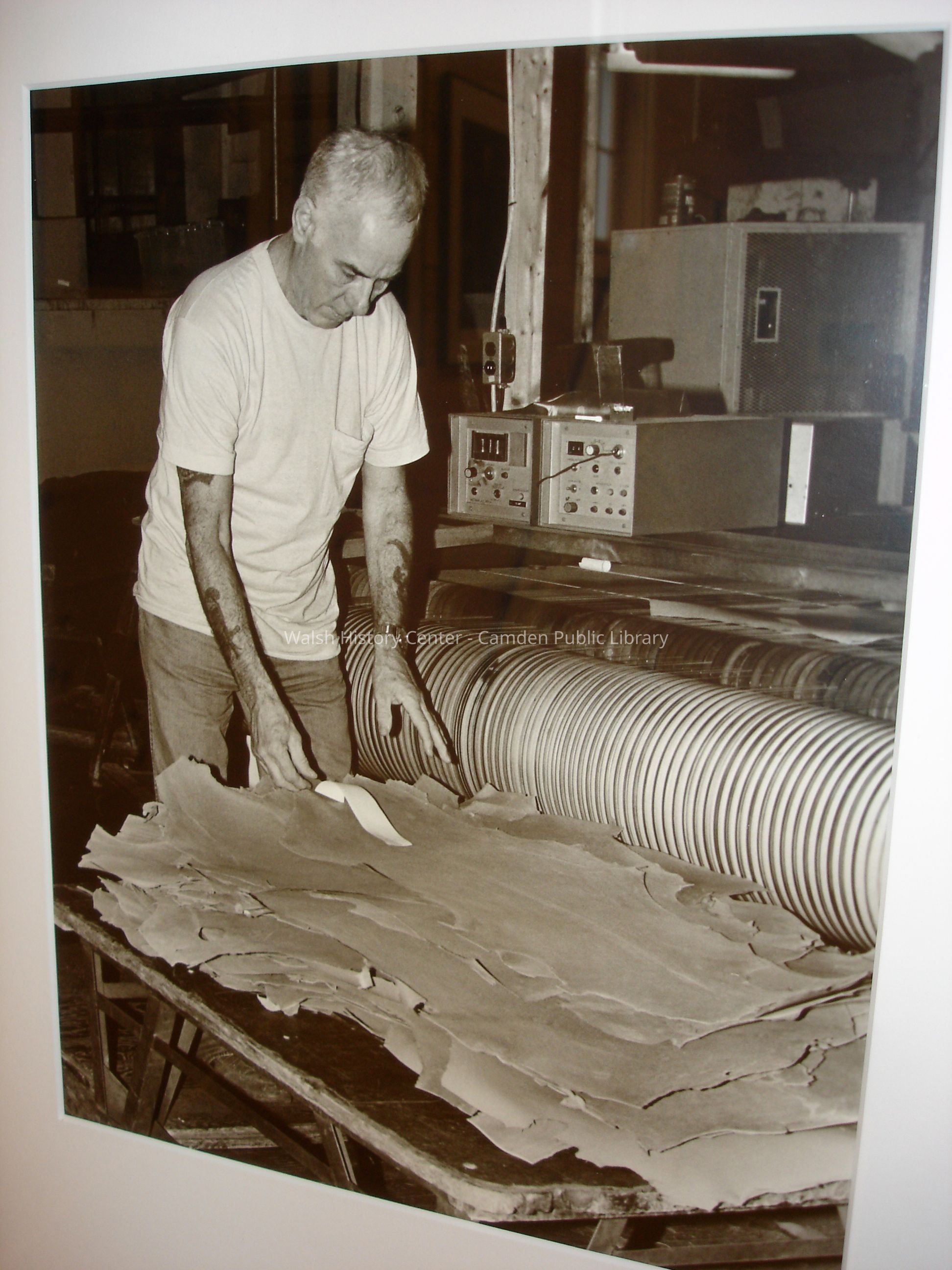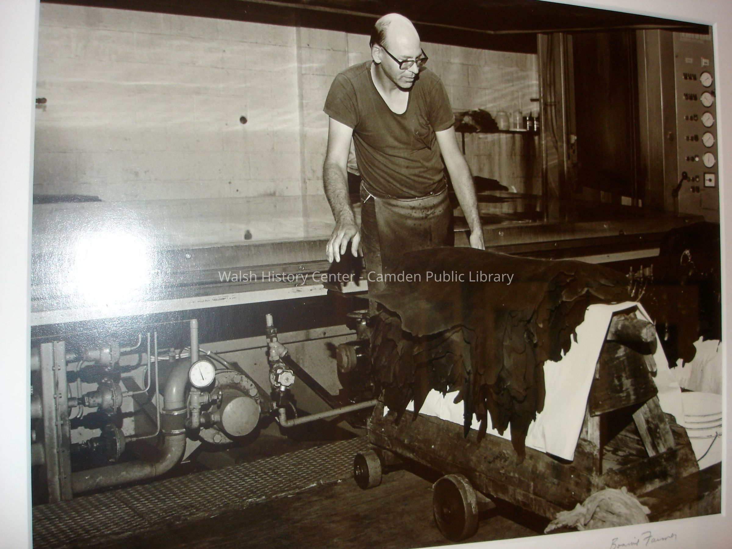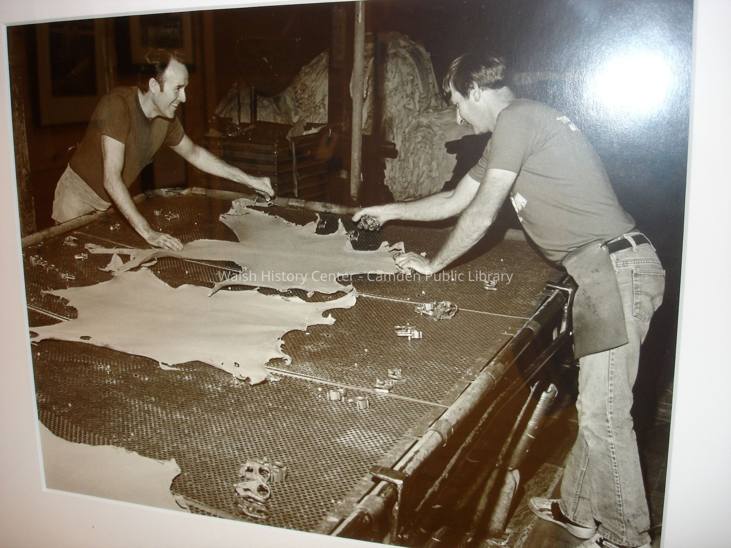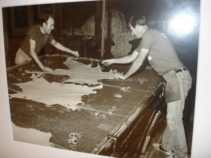 23 black and white framed photographs of the Camden Tanning Corporation interior and employees. The tannery was established in 1954 on outer Washington Street in the former Camden Woolen Company building. These images were taken just prior to the closing of the facility in 1999. The building has since been destroyed.Collection