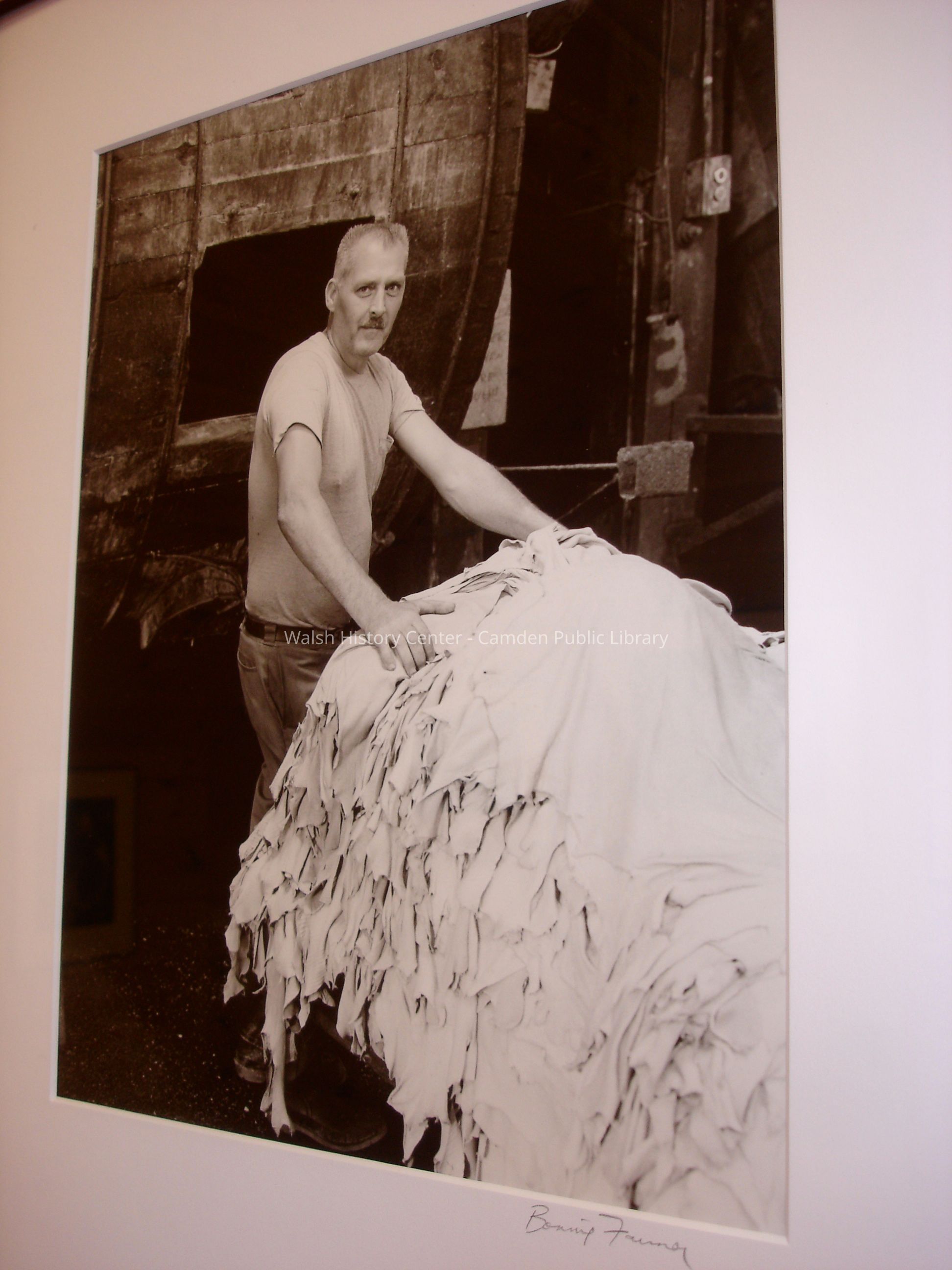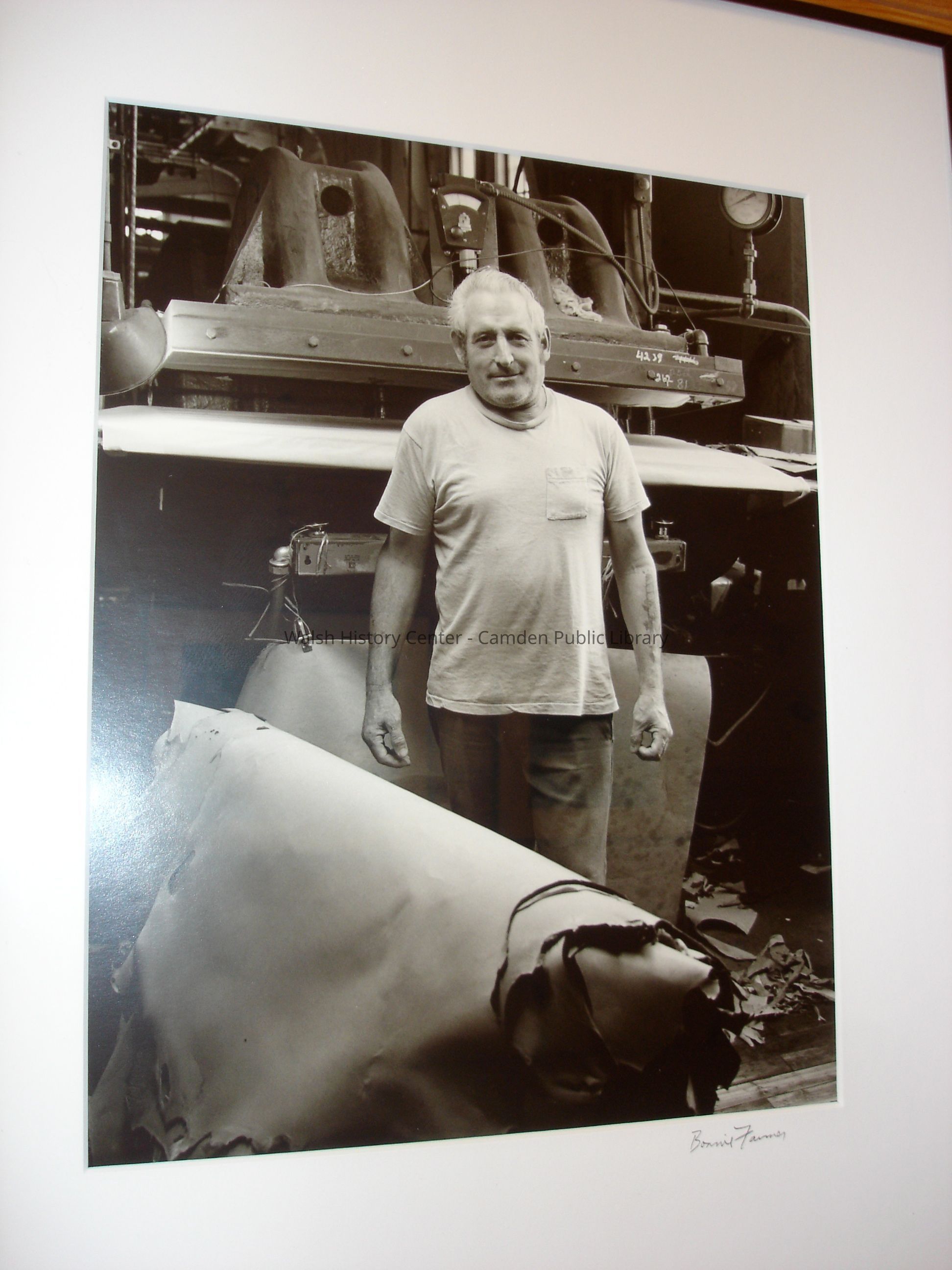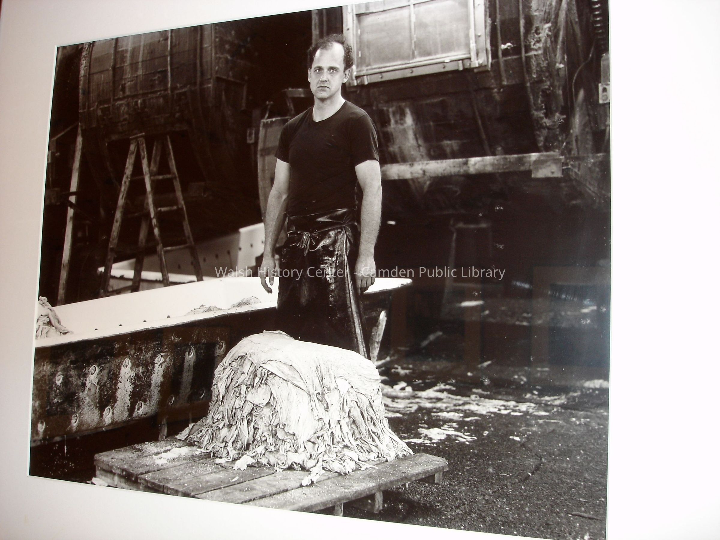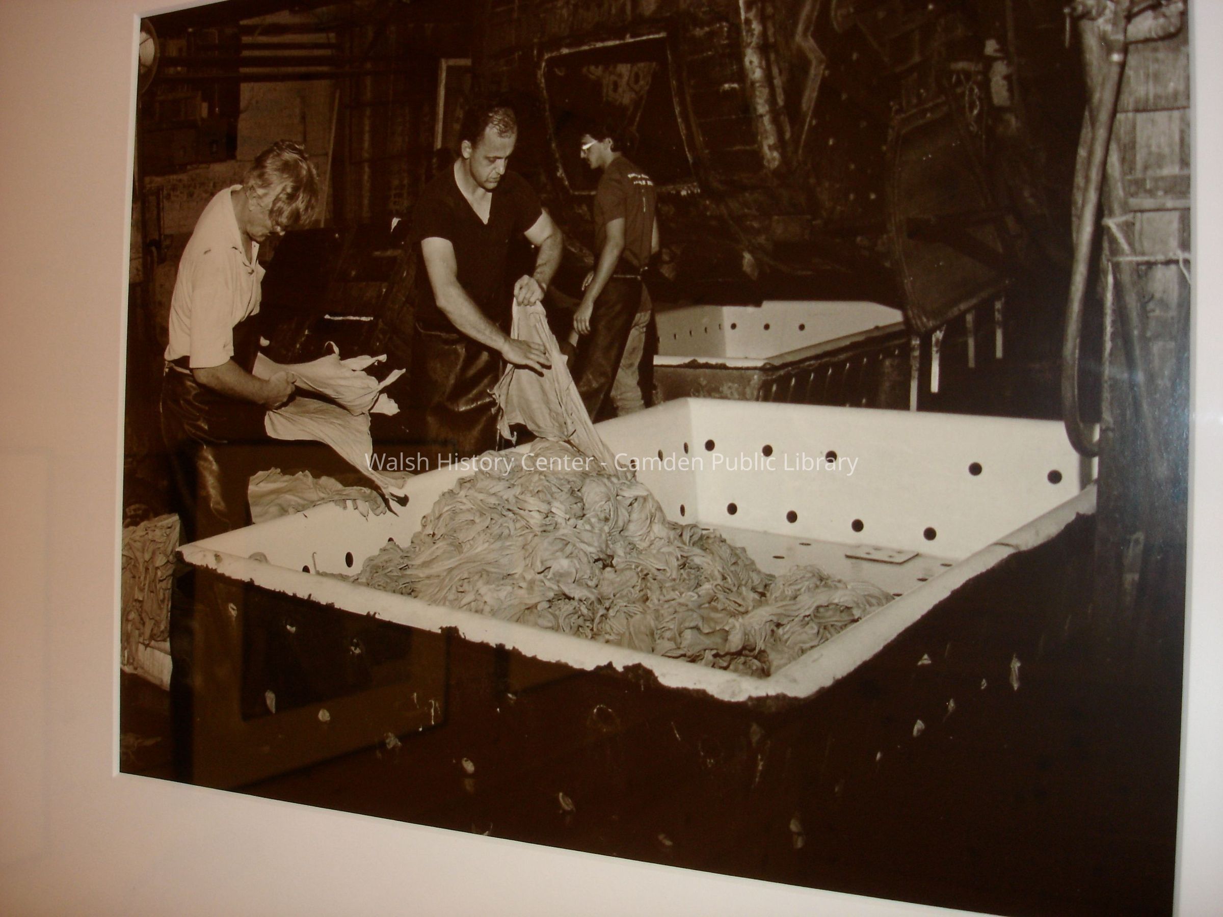 23 black and white framed photographs of the Camden Tanning Corporation interior and employees. The tannery was established in 1954 on outer Washington Street in the former Camden Woolen Company building. These images were taken just prior to the closing of the facility in 1999. The building has since been destroyed.Collection