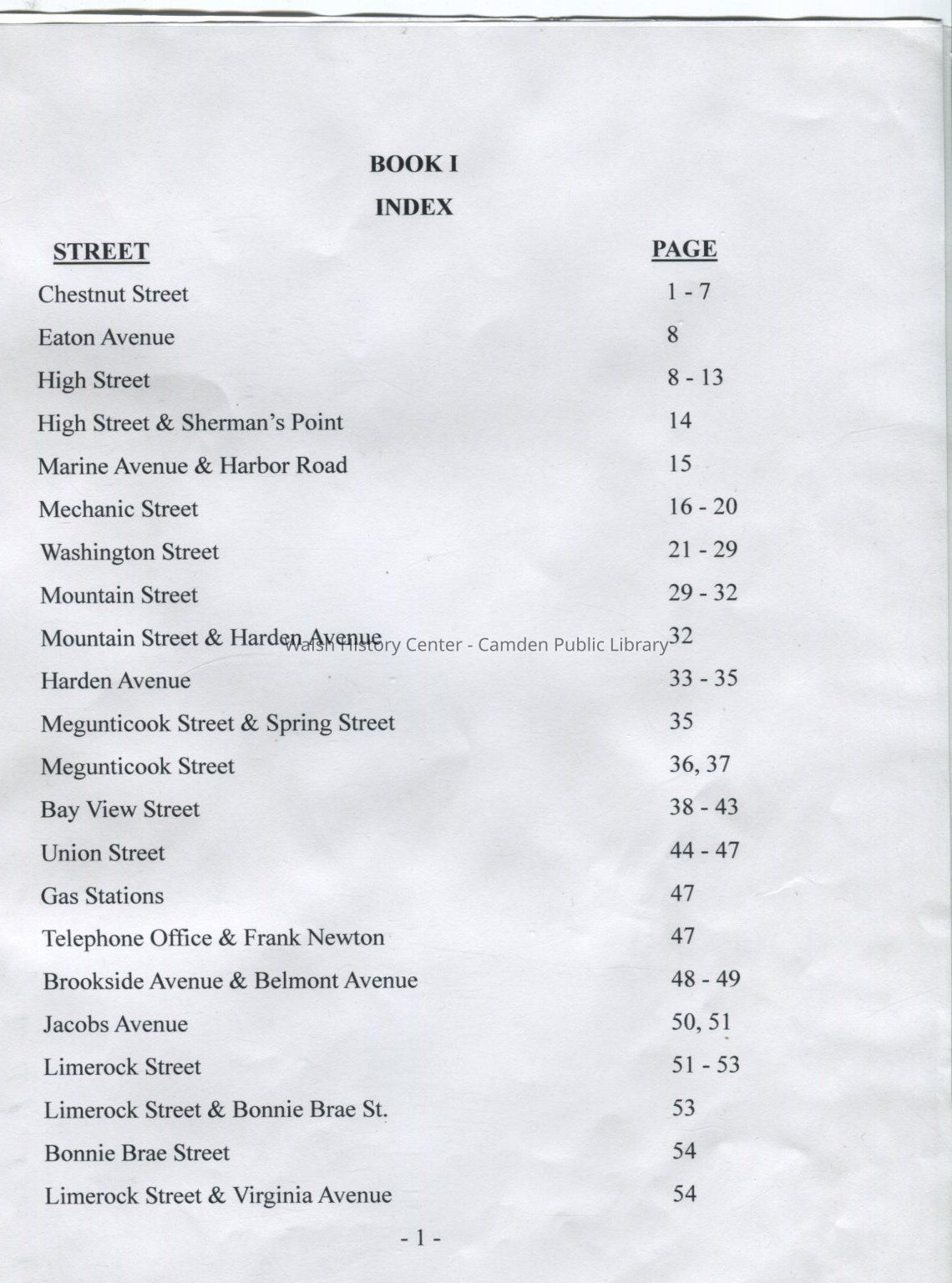 Volume 1 of a two volume set of three-ring binders of photographs of each home in Camden. Photos were part of a Depression-era project and were taken circa 1937. Photographer was Alden "Spike" Danery of Camden, a recent Camden High School graduate. Photos are organized by street. Also included were two memo books used as an index to streets.