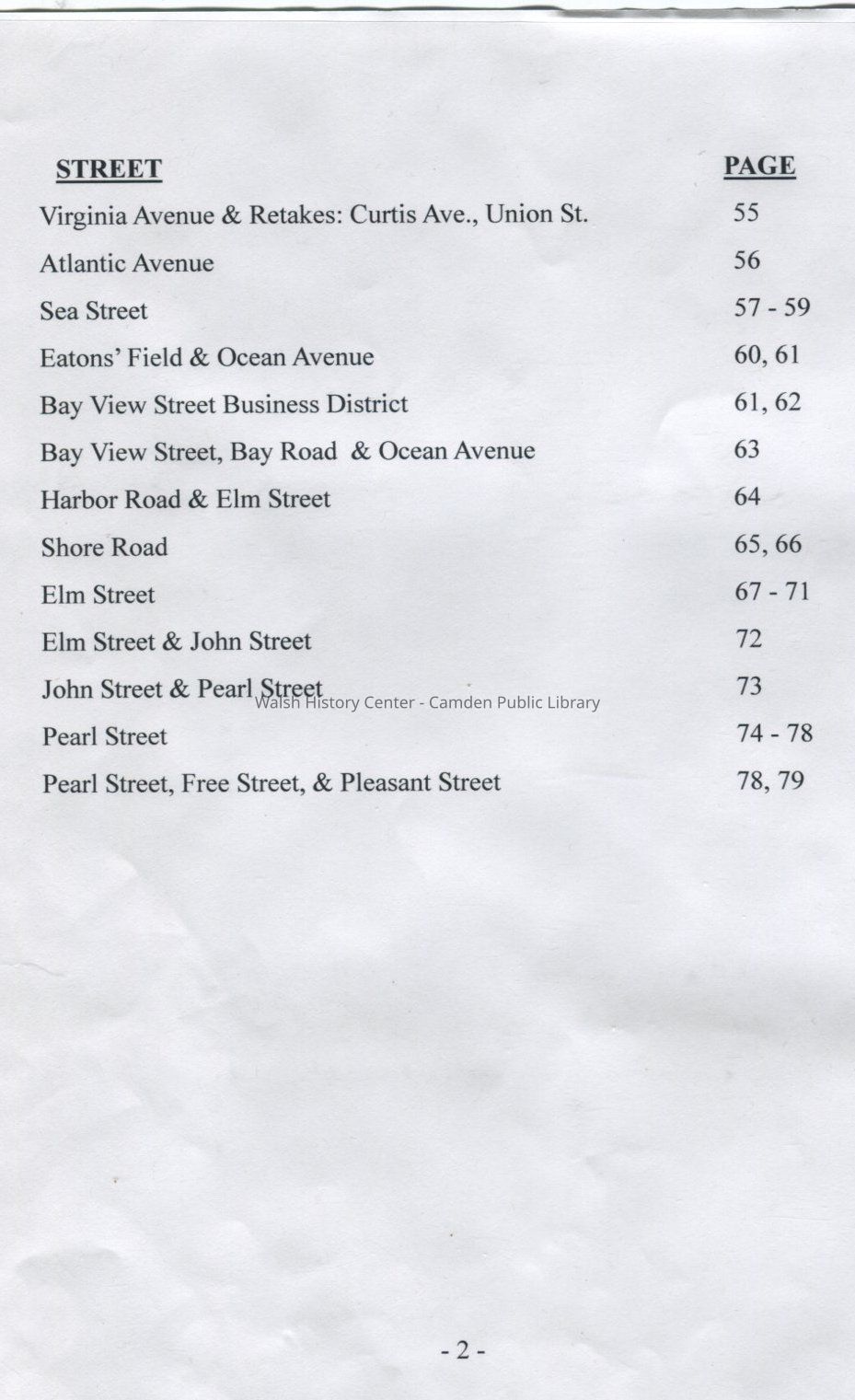 Alden Street, Atlantic Avenue, Barnestown Road, Bayview Street, Belmont Avenue, Blake Street, Bonnie Brae Street, Branch Street, Brookside Avenue, Camden, Cedar Street, Central Street, Chestnut Hill, Chestnut Street, Cobb Road, Cross Street, Curtis Avenue, Dailey Street, Dillingham Point, Eaton Avenue, Eatons' Field, Elm Street, Free Street, Gould Street, Grove Street, Harbor Hill, Harbor Road, Harden Avenue, High Street, Highland Avenue, Hope Road, Hosmer's Pond, Jacobs Avenue, John Street, Knowlton Street, Lake City, Lake Road, Limerock Street, Maine, Maple Street, Marine Avenue, Mechanic Street, Megunticook Street, Melvin Heights, Mill Street, Millville, Molyneaux Road, Mountain Street, Mt. Battie Street, Norwood Avenue, Oak Street, Ocean Avenue, Park Street, Pearl Street, Penobscot Avenue, Pleasant Street, Pond Road, Rawson Avenue, Riverside Drive, Riverside Park, Sand Street, Sea Street, Sherman's Point, Shore Road, Spring Street, Spruce Street, Start Road, Tannery Lane, Thomas Street, Trim Street, Turnpike Road, Union Street, Virginia Avenue, Washington Street, Willow Street, Wood Street