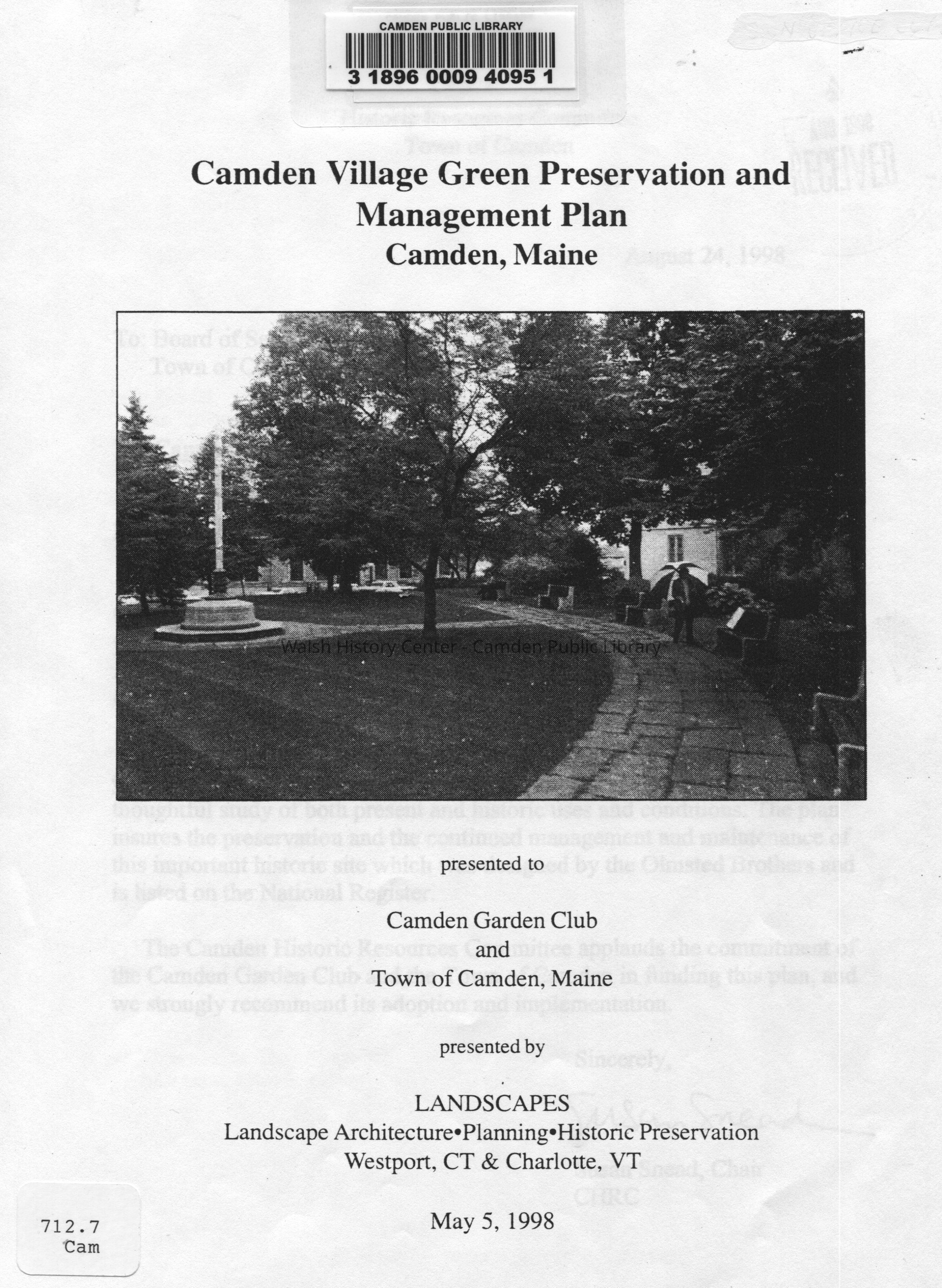 Preservation and management plan for the Camden Village Green. Includes early history and creation, the war memorial, recent history and landscape preservation options and maintenance for the future.