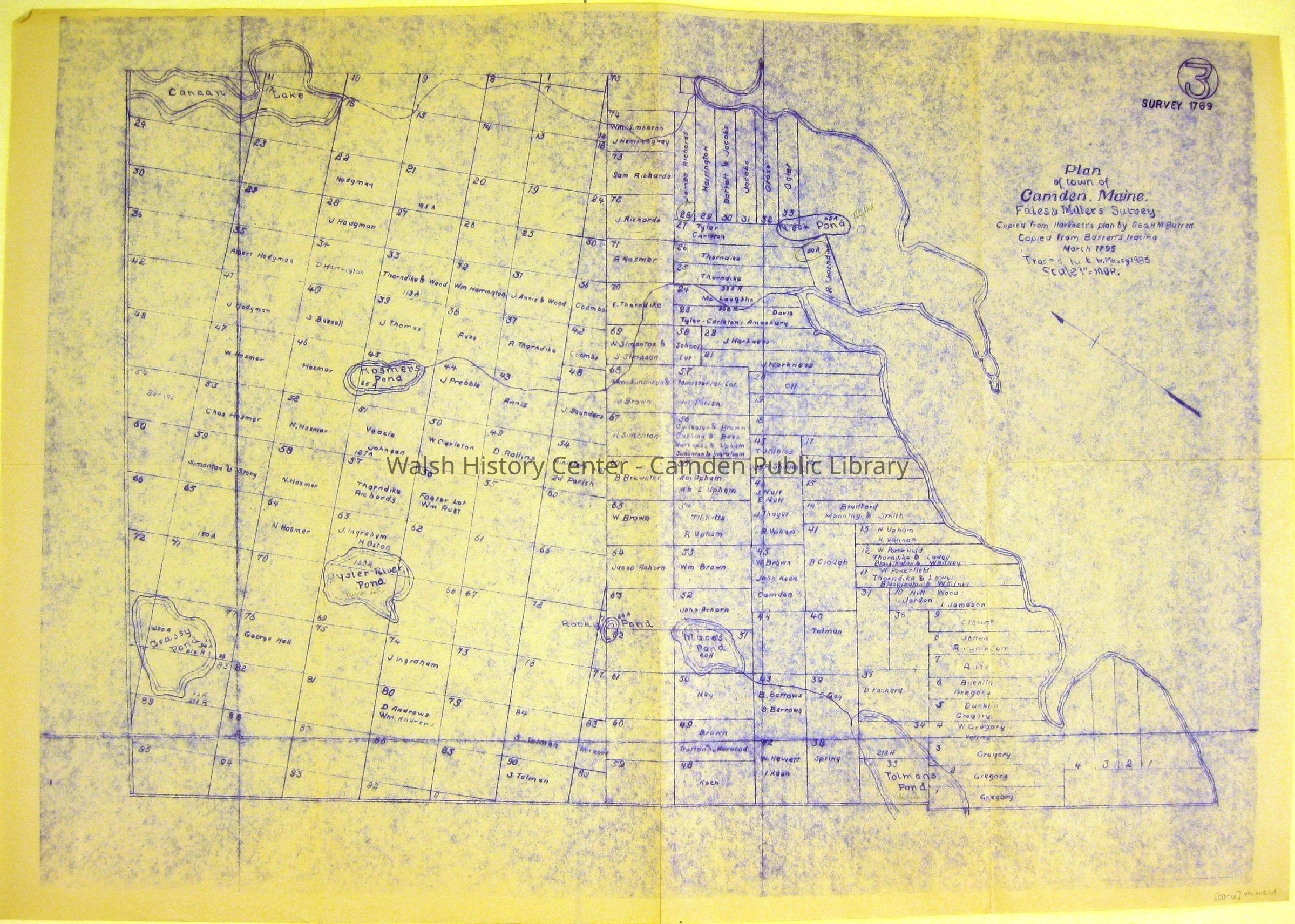CAMDEN. PLAN OF CAMDEN, MAINE, FALES' AND MILLER'S SURVEY COPIED FROM HARKNESS' PLAN BY GEO. M. BARRETT. Copied from Barrett's tracing March