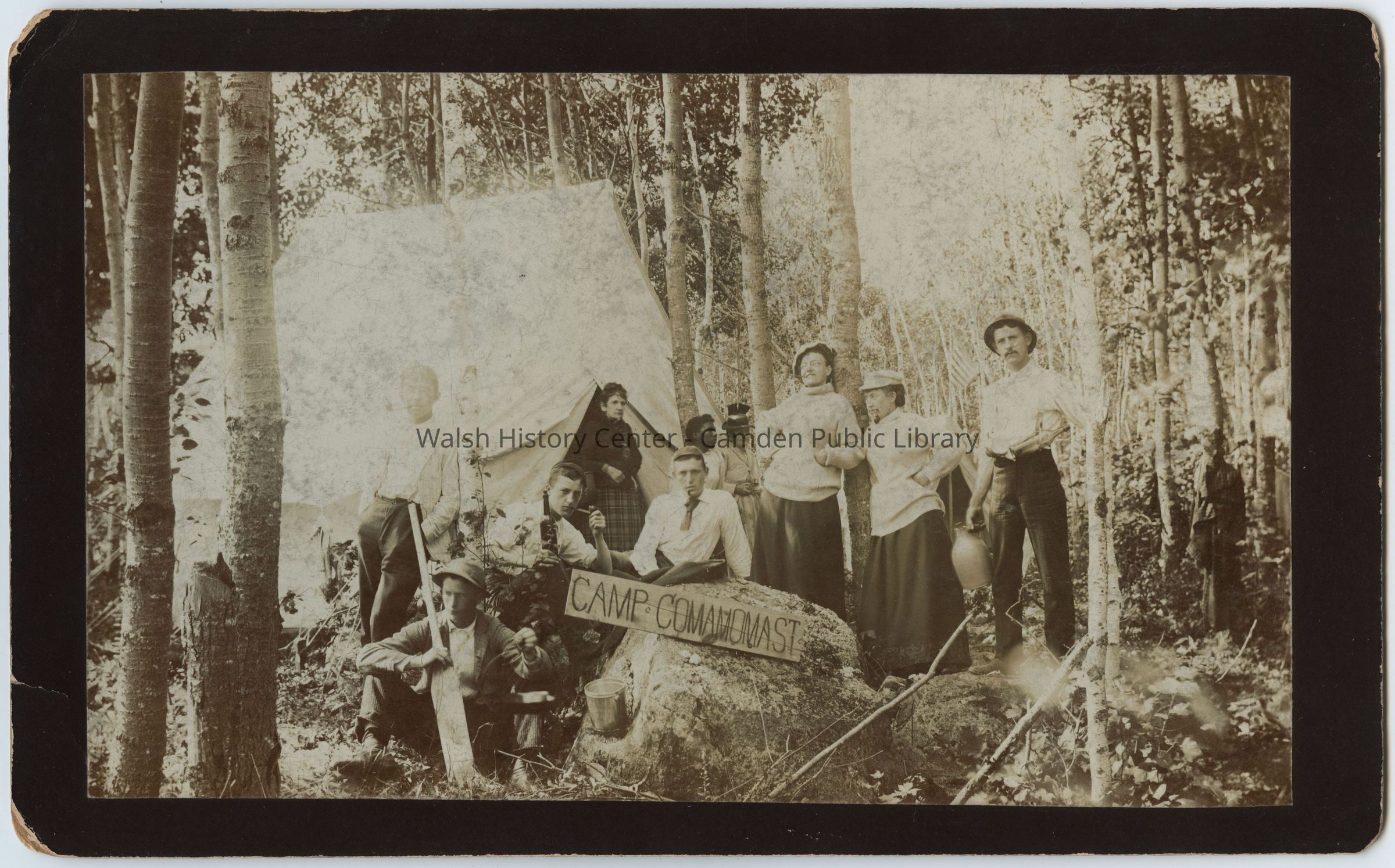 Photograph labeled "Camp Comamomast, Sept 29, 1892," showing several people, including a black woman in the background, outside a tent in the woods with a sign labeled Camp Comamomast. Several of the men and women are smoking pipes.Photograph Details