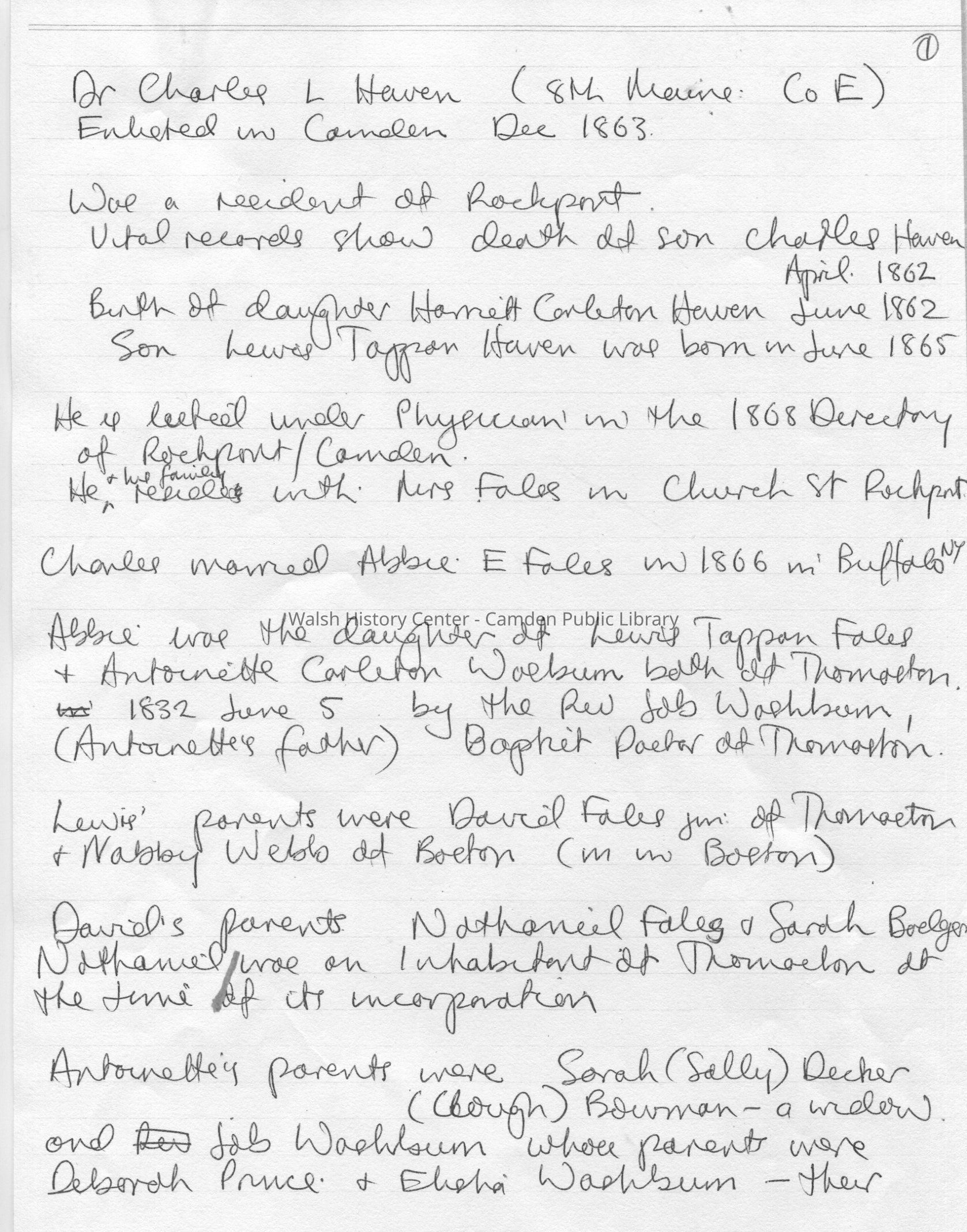 Photocopies of documents relating to the Carleton, Haven, Fales, and Washburn families of Rockport and Camden. These were compiled by a visiting researcher who gave copies for the collection. Includes Civil War pension application by Dr. Charles L. Haven's widow Abbie E. (Fales) Haven, the Civil War enlistment papers of Dr. Charles Haven in the Veteran Reserve Corps, Reg. 24, Co. B, and the researcher's handwritten genealogy of the families.Collection