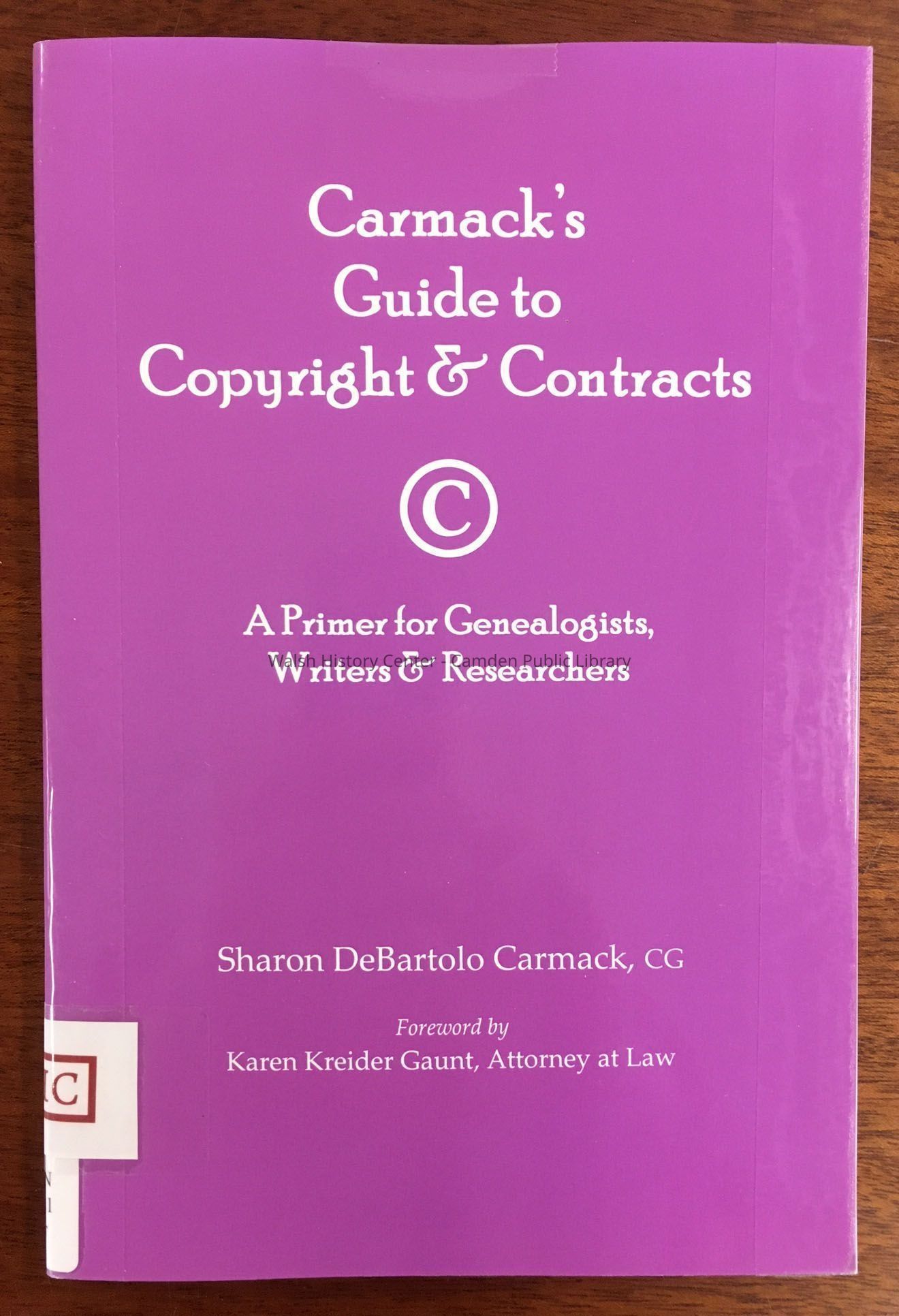 "In 'Carmack's Guide to Copyright & Contracts: A Primer for Genealogists, Writers & Researchers,' Sharon DeBartolo Carmack uses her popular, conversational writing style to answer your questions. In simple language, she explains copyright, rights, and contracts and how these apply to genealogists, writers, and researchers."--Back cover