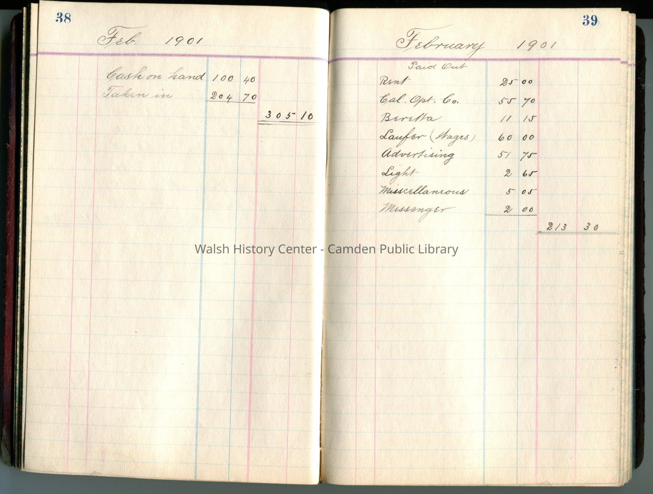 Cash book of the Laufer and Noe Opticial Company.Entry/Object ID