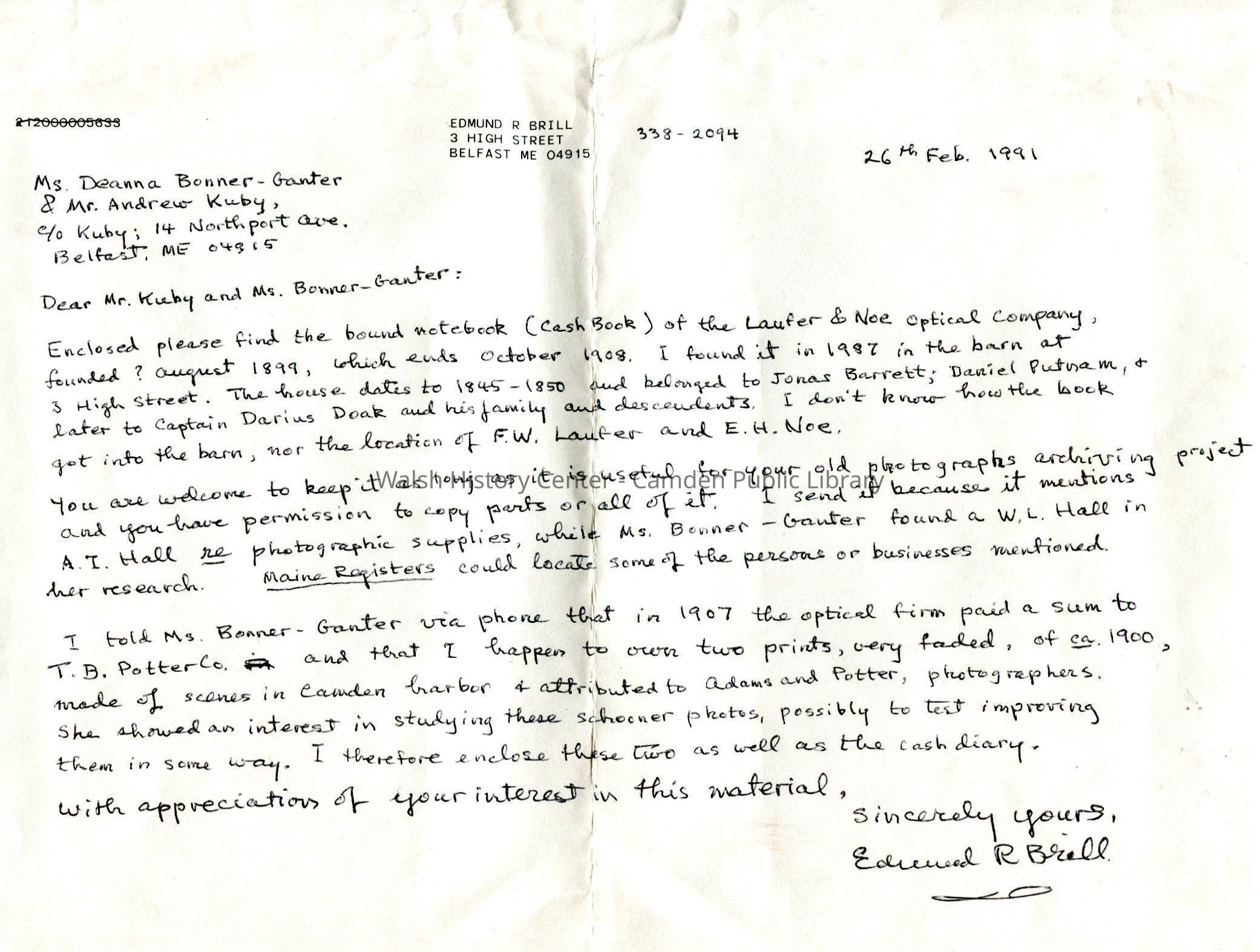 Cash book of the F.W. Laufer and E.H. Noe Optical Company. Entries from August 1899--October 1908. Book was found in a barn at 3 High Street in Belfast, Maine. The location of the optical shop is unknown.Collection