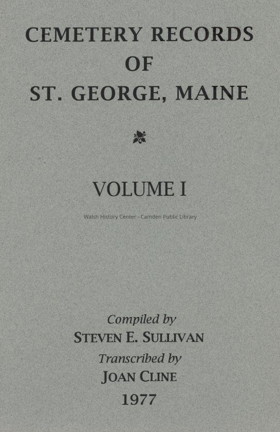 A photocopy of the compilation of cemetery records of St. George, Maine as compiled by Steven E. Sullivan and transcribed by Joan Cline. Not all of the listings are indexed. The listings are arranged in two volumes. Vol. 1 contains listings for Old North Parish Cemetery, New North Parish Cemetery, South Parish Cemetery. Vol. 2 contains the records for the smaller cemeteries of St. George and Clark Hill and Foster of St. George and Seaside Cemetery of Tenants Harbor.Collection