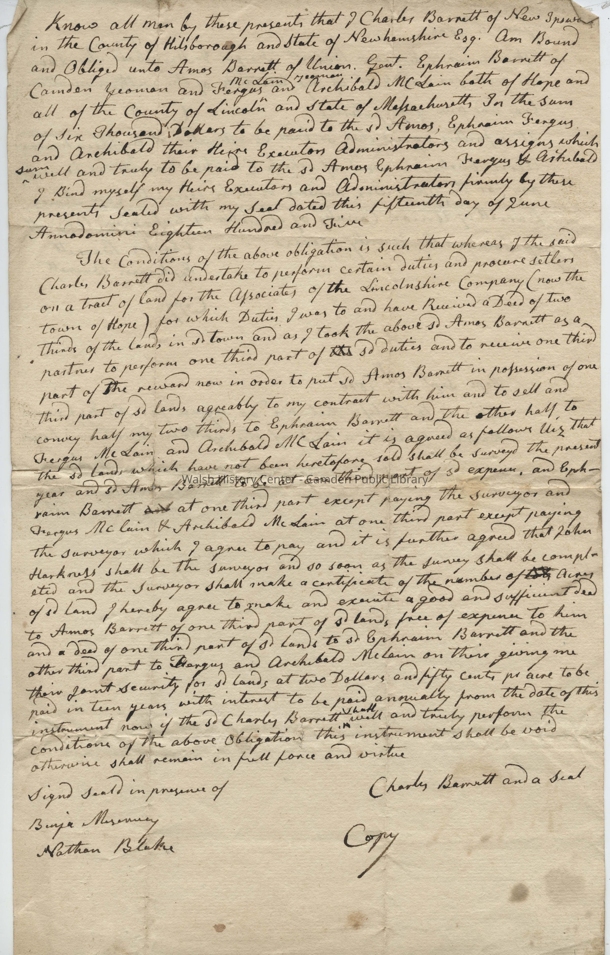 Know all men by these presents that I Charles Barrett of New Ipswich, in the County of Hilsborough and State of New Hampshire Esq. Am Bound and Obliged unto Amos Barrett of Union. Gent. Ephraim Barrett of Camden Yeoman and Fergus McLain Yeoman and Archibald McLain both of Hope and all of the County of Lincoln and State of Massachusetts In the Sum of Six Thousand Dollars to be paid to the sd Amos, Ephraim Fergus and Archibald their Executors Administrators and assigns which sum well and truly to be paid to the sd Amos, Ephraim Fergus & Archibald I bind myself my Heirs Executors and Administrators firmly by these presents Sealed with my Seal dated this fifteenth day of June Annodomini Eighteen Hundred and Five