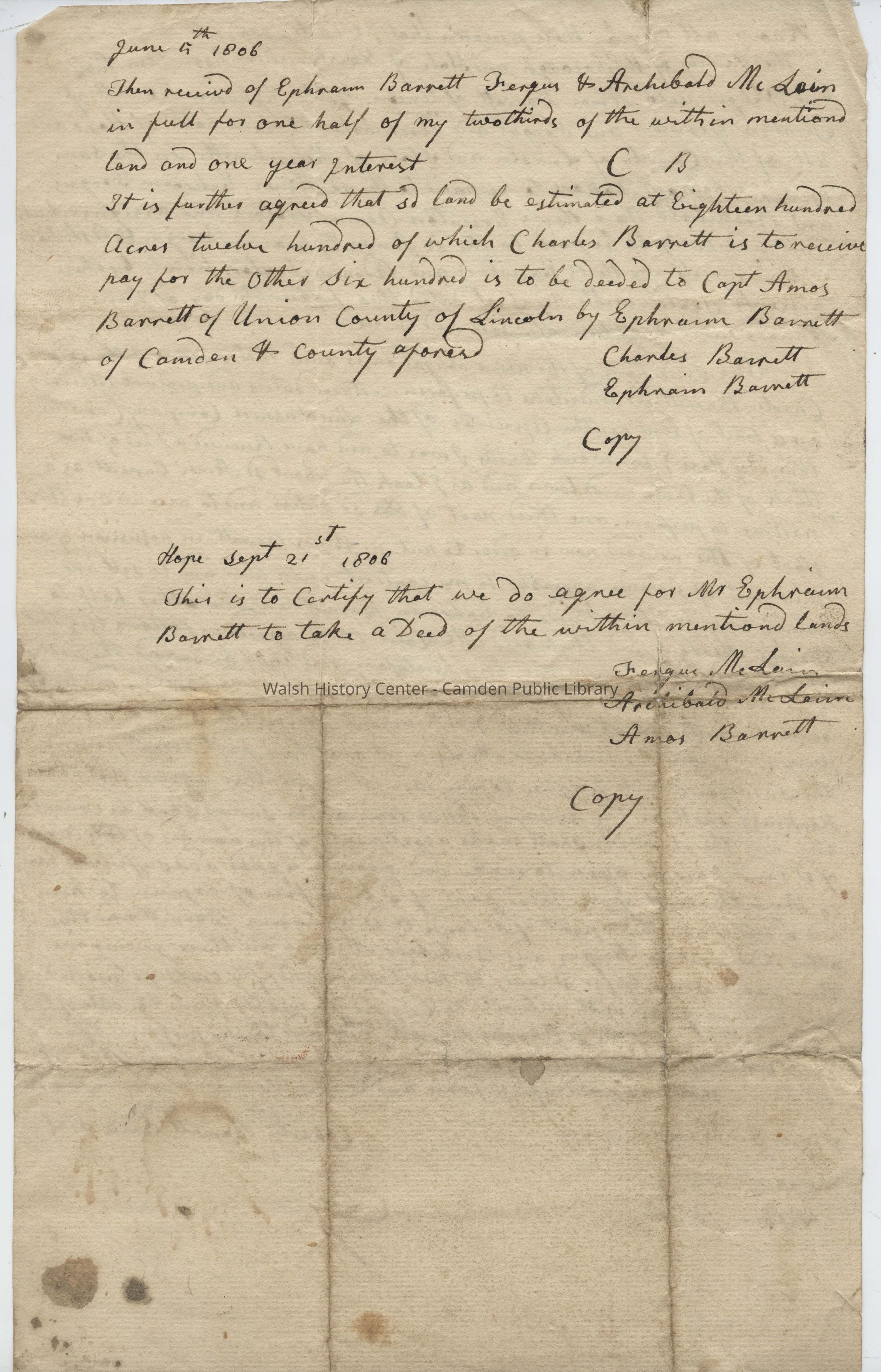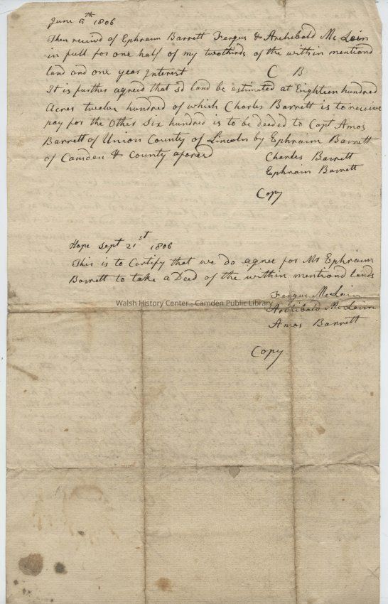 It is further agreed that sd land be estimated at eighteen hundred Acres twelve hundred of which Charles Barrett is to receive pay for the other Six hundred is to be deeded to Capt Amos Barrett of Union County of Lincoln by Ephraim Barrett of Camden & County aforesaid