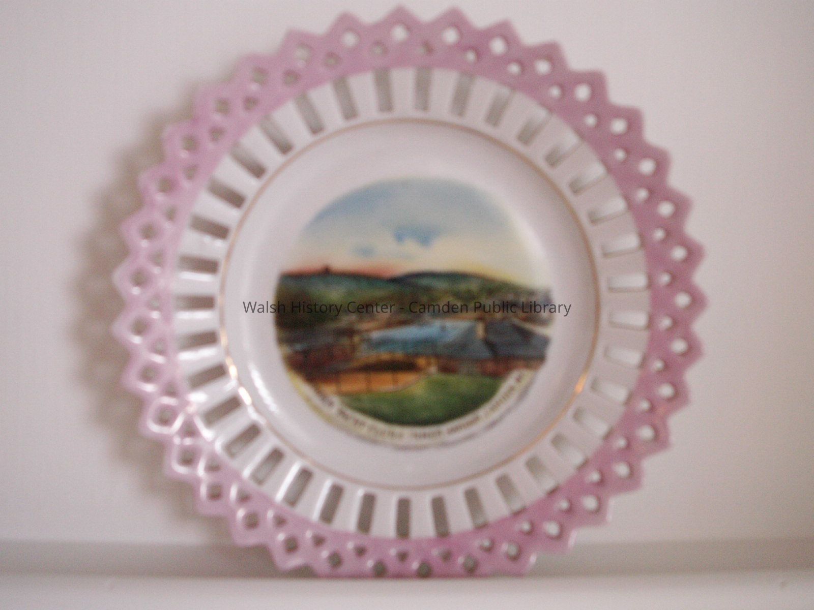China dish, white with pink border. Center has image of Camden harbor with inscription, "Camden Yacht Club & Inner Harbor, Camden, ME."