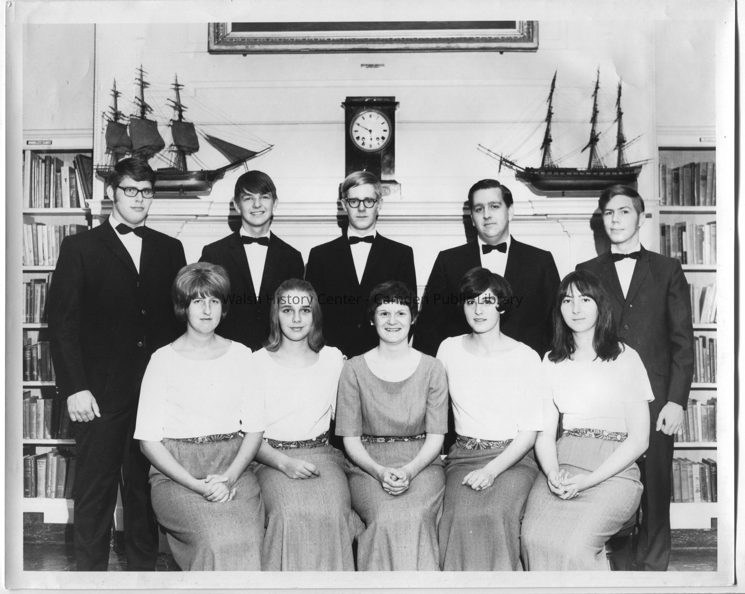 Black and white photograph of the Camden-Rockport High School chorus in the reading room of the Camden Public Library. The chorus was led by music director Janice Parkinson.Collection