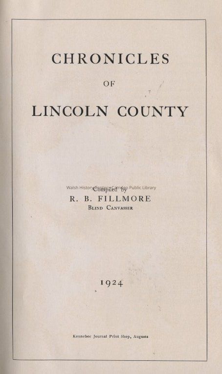 Alna, Bremen, Bristol, Chamberlain, Crie's Gift Shop, Damariscotta, Dresden, E.L. Porter Company, Edgecomb, Ensign Otis, Gilchrest Monumental Works, Gregory's, Guy W. Hussey & Co., Jefferson, Knox Hotel, Lemond House, Leon A. Dodge Insurance, Maine, Monhegan Island, Muscongus Bay, New Harbor, Newscastle, Nobleboro, Page Shoe Store, Pemaquid, Perkins Brothers, Perkins Stove Company, Rockland Hair Store, Rockport Lime Company, Round Pond, Somerville, South Bristol, Southport, Stonington Furniture Company, Thorndike Hotel, Tibbetts & Carroll, Union Mutual Life Insurance Co., Waldoboro, Warren Weston Creamer, Westport, Wiscasset, Justices of the peace, Town officers