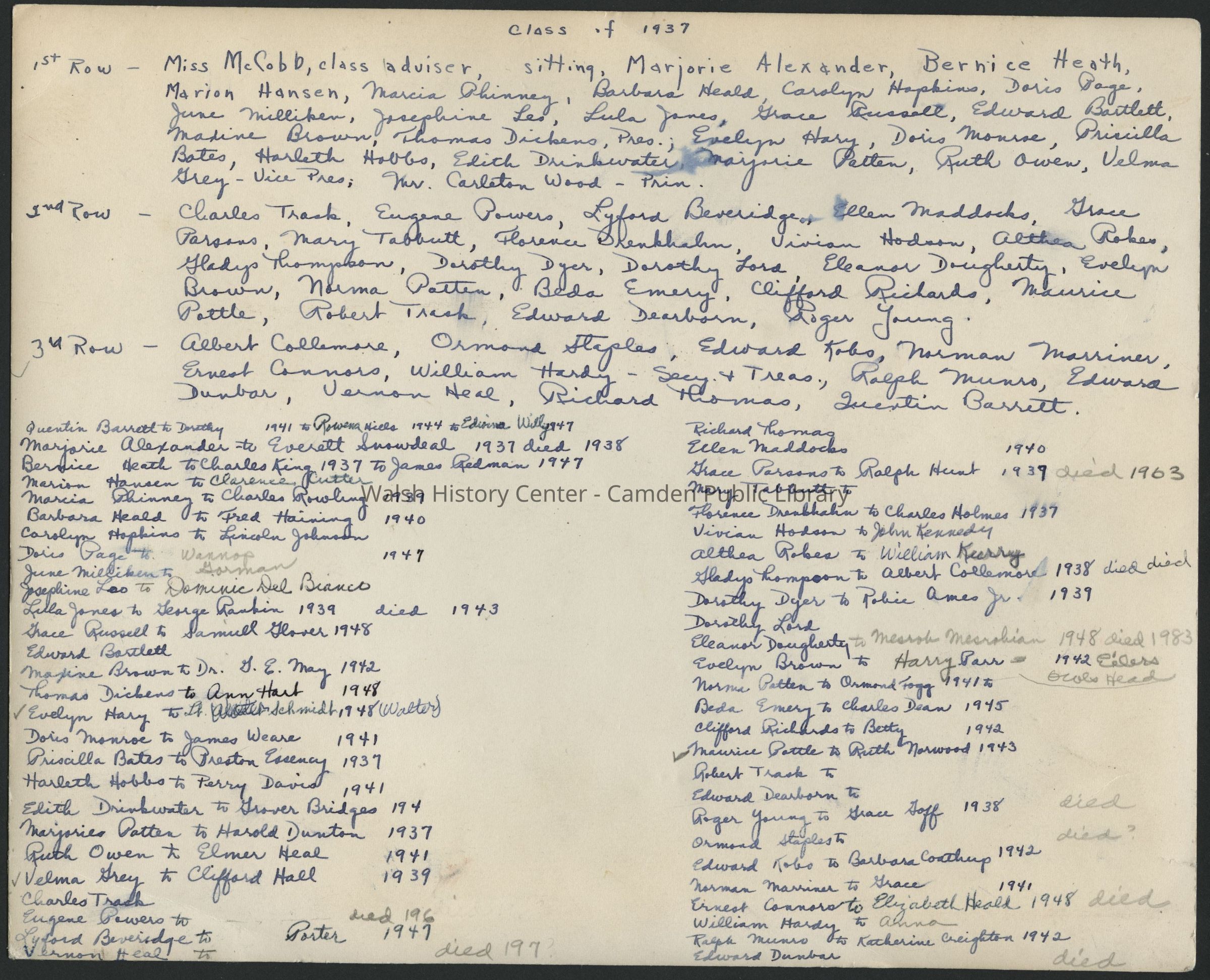 Camden, Camden High School, Camden High School Class of 1937, Class photographsOther Names and Numbers