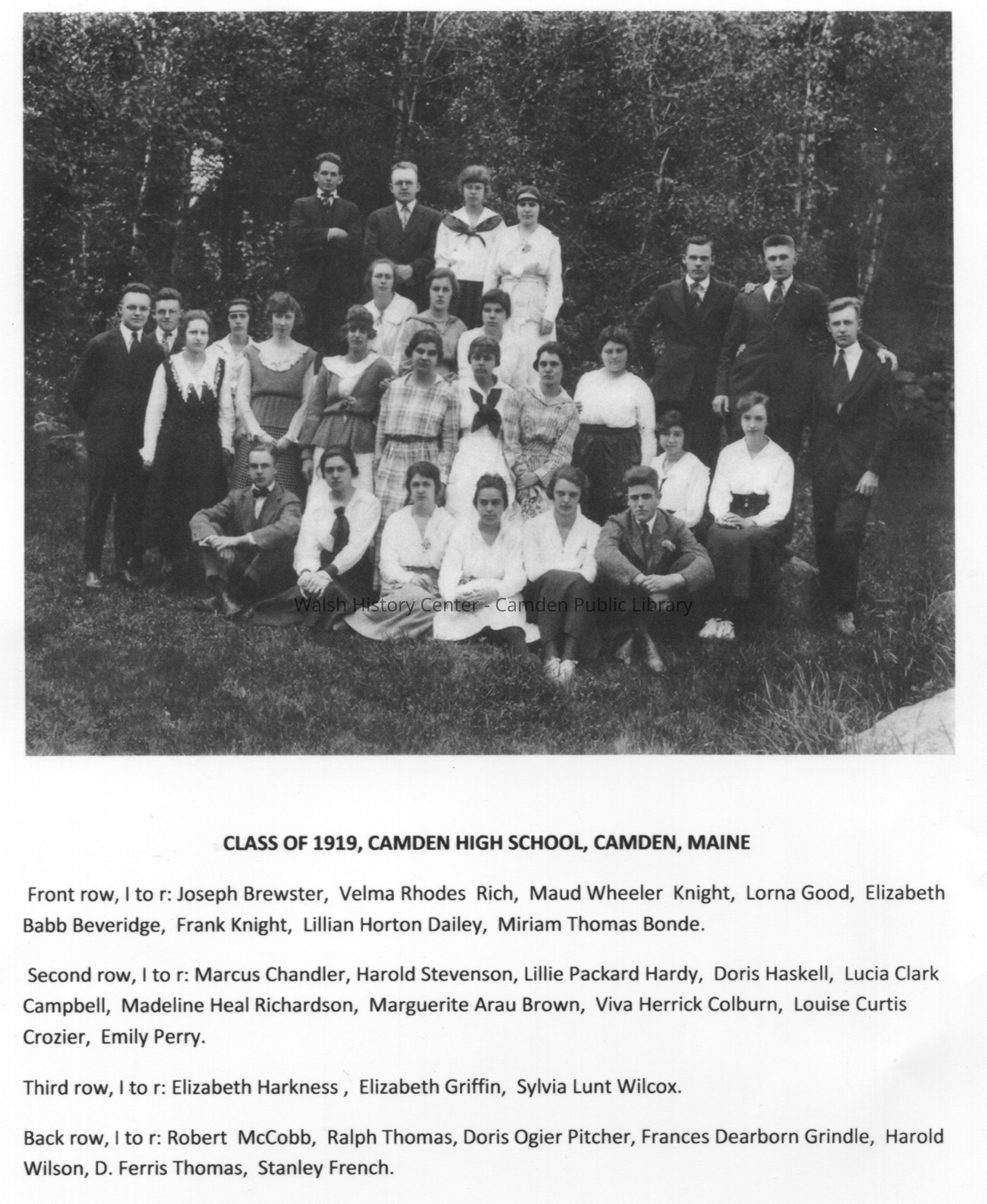 Print of scanned photo of Camden High School Class of 1919. Student names are identified by row. Emily Perry is seated in the second row, far right.Collection
