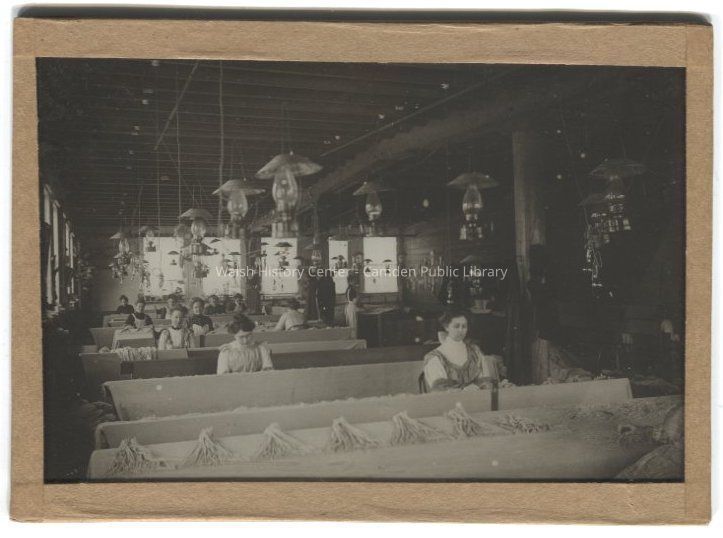 Glass negative of female employees in the closing room of the Knox Woolen Company. In the closing room, the ends of the flat woven felts are placed on tables, and spliced or "closed" into endless belts by matching the many threads. The Knox Mill was the first mill in the United States to use this "closing" process of making endless felts.Collection