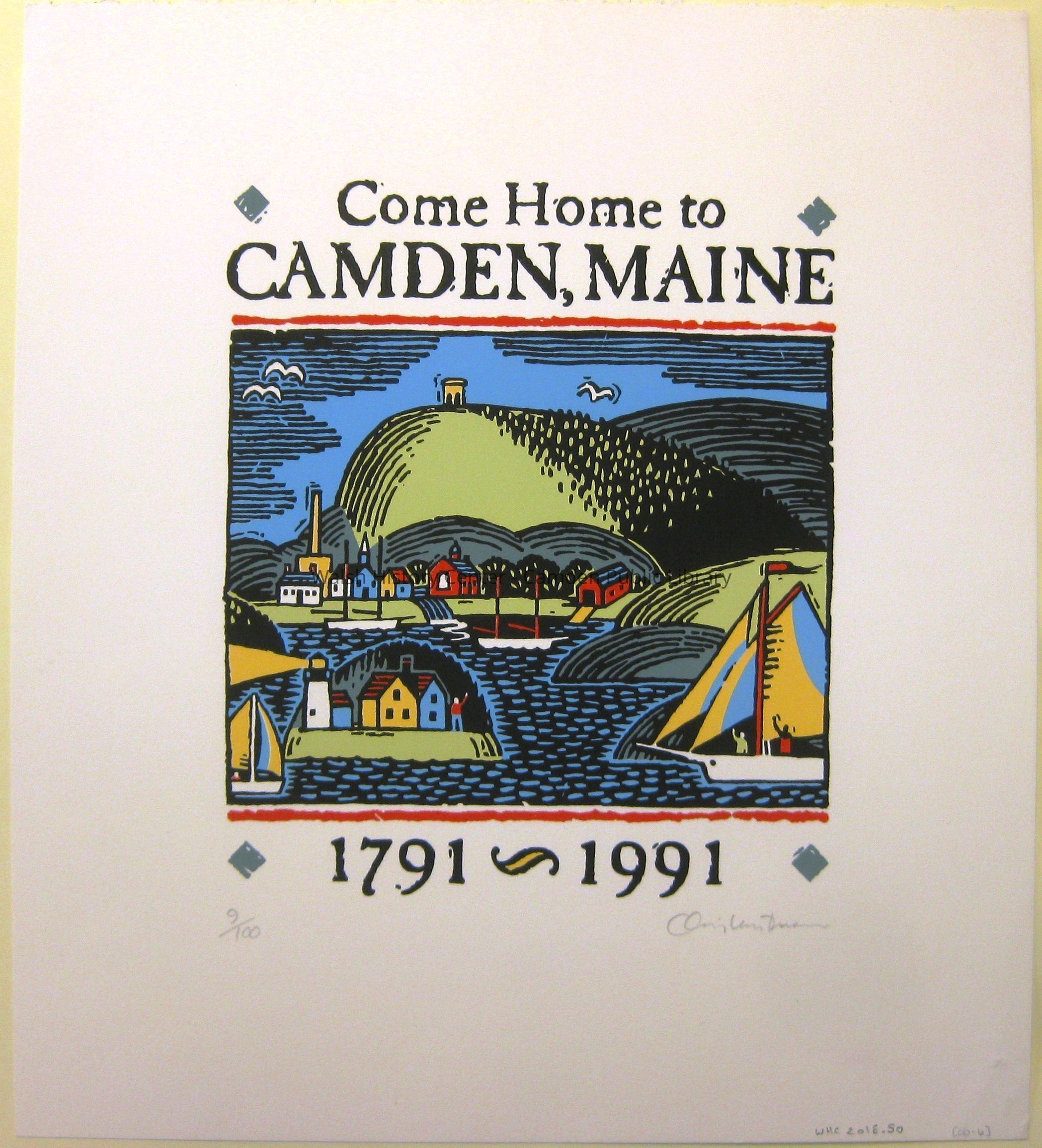 COME HOME TO CAMDEN, MAINE 1791-1991. Original colour print. Stylized view from mouth of harbour to Mt. Battie. Number 9 of 100 prints, signed Chris van Dusen. In lower right corner is "[00-6]".Collection