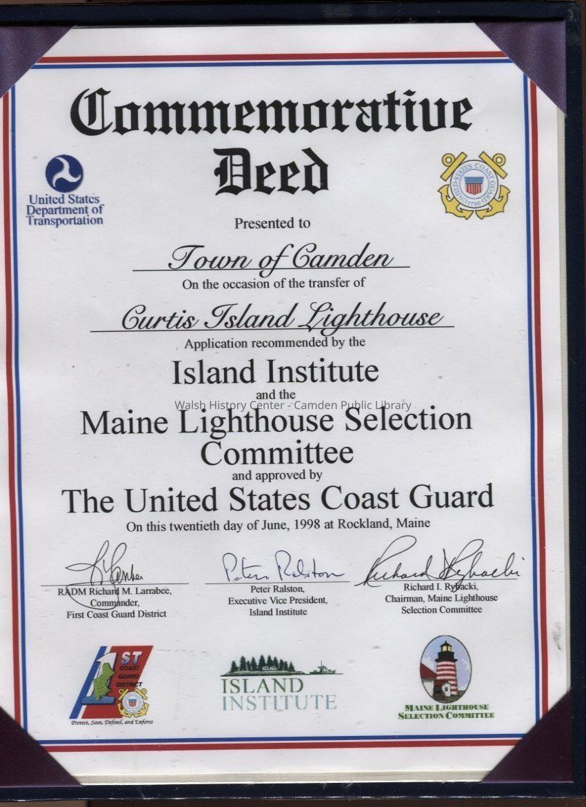 Commemorative Deed presented to the Town of Camden, Maine on the occasion of the transfer of ownership of the Curtis Island lighthouse from the U.S. Coast Guard to the town.Collection