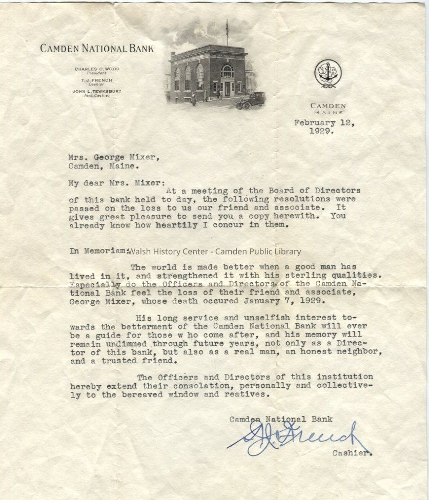 Letter of condolence from T. J. French, cashier of Camden National Bank, to Mrs. George Mixer on behalf of the officers and directors of Camden National Bank regarding the death of George Mixer on 7 January 1929.Collection
