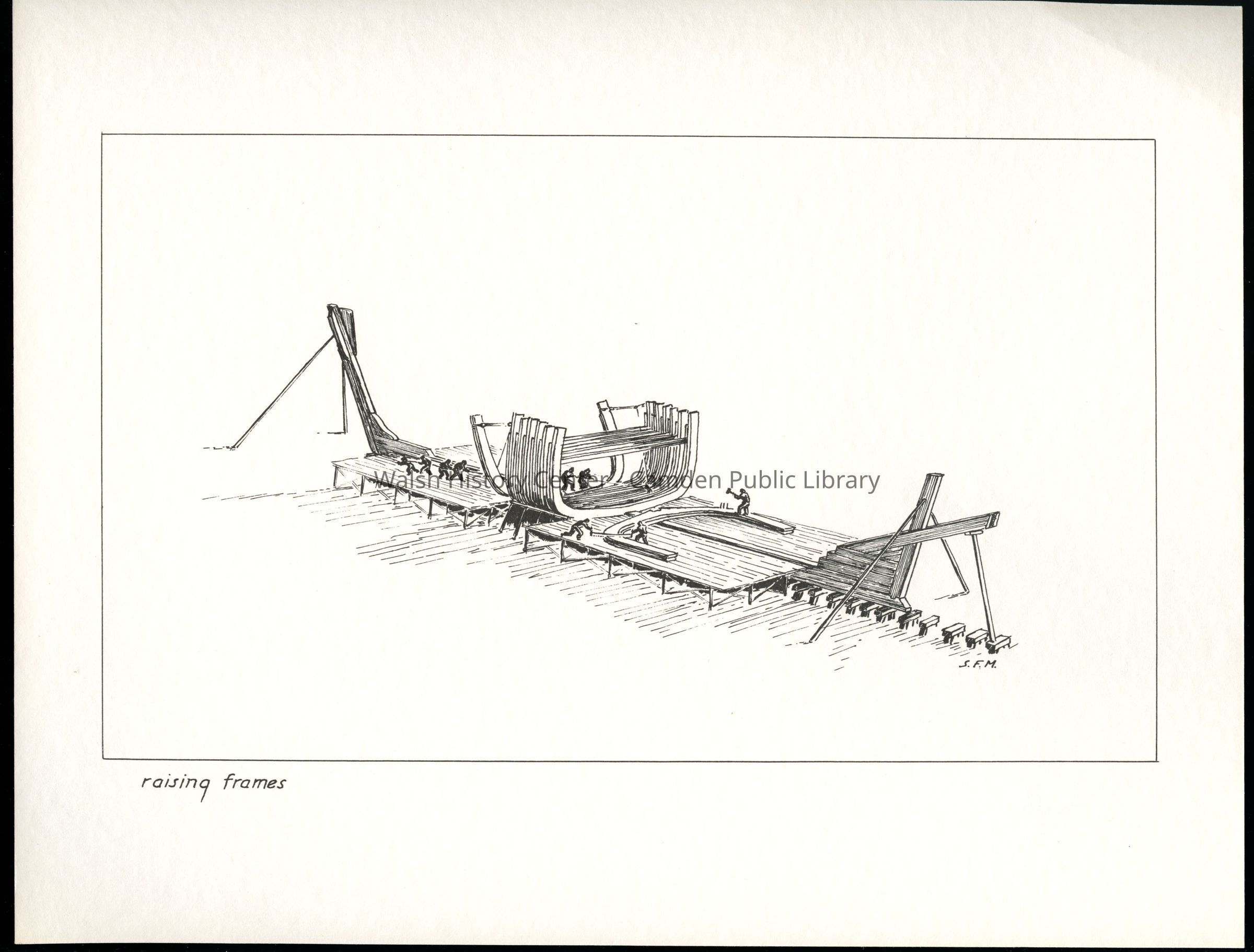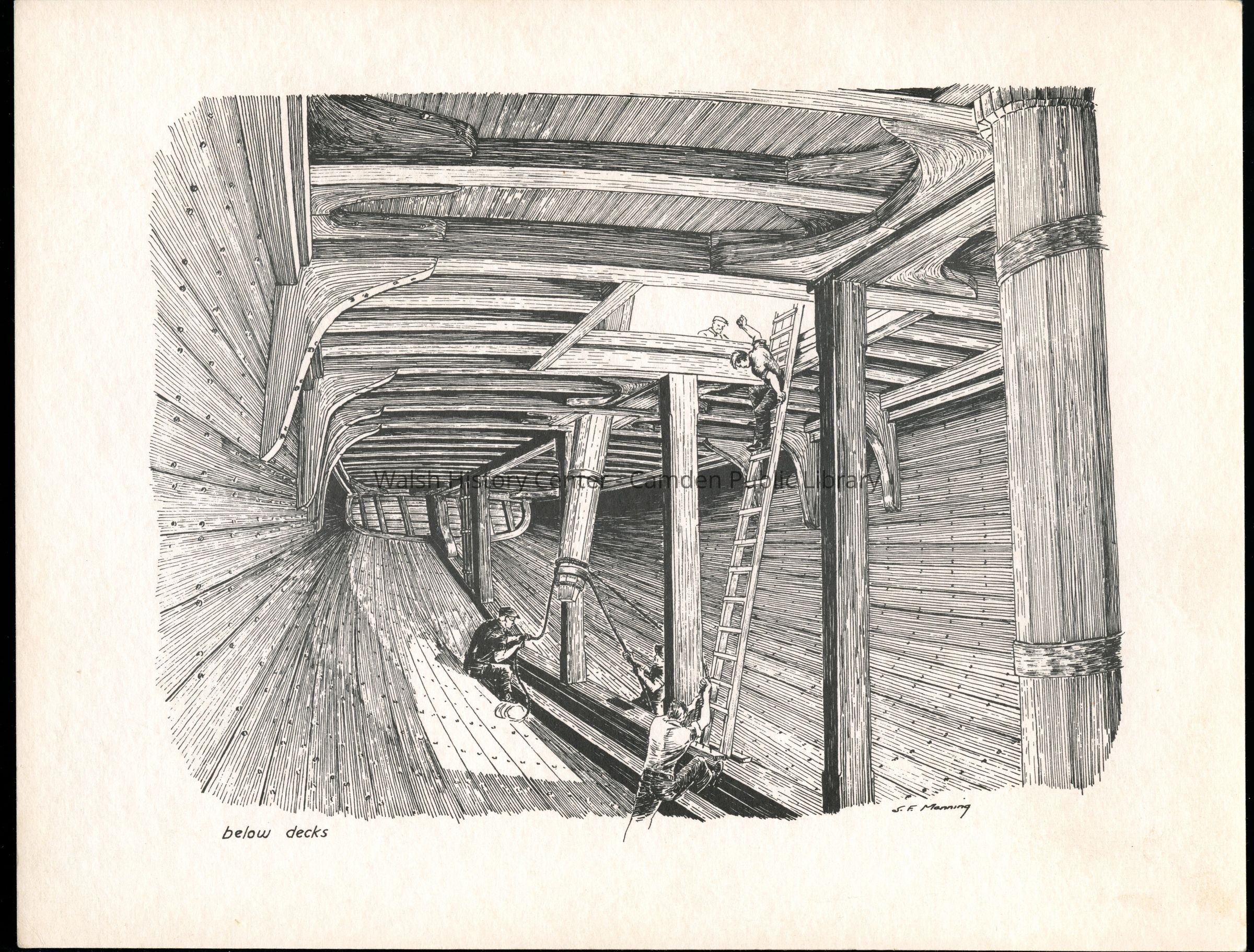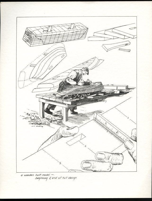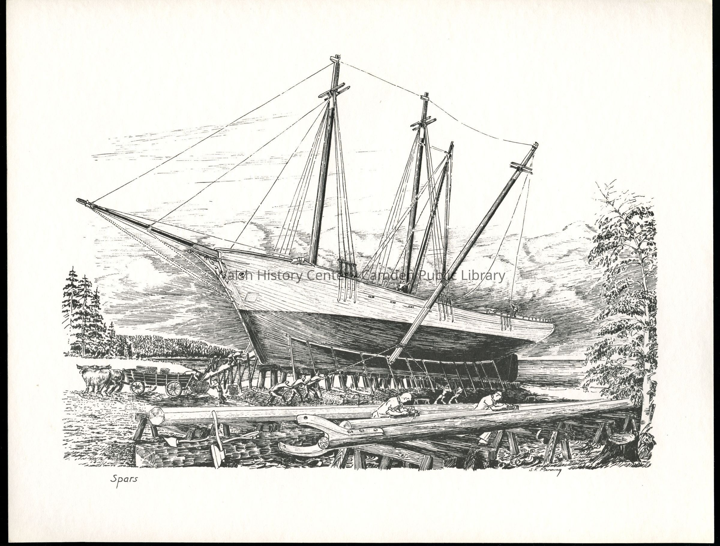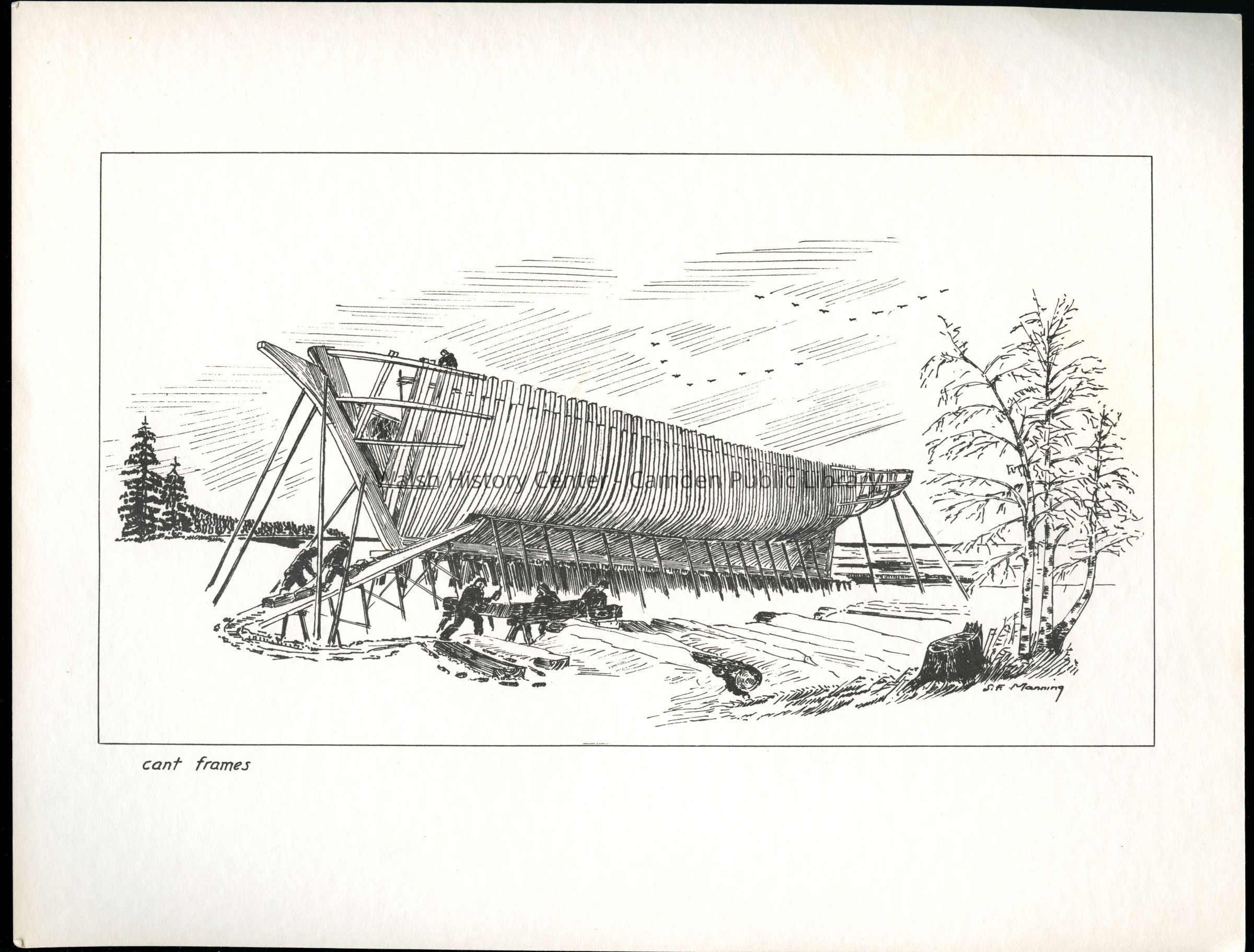 Set of loose 12 pen and ink drawings of the stages of construction of a schooner on the Maine coast by marine illustrator Samuel F. Manning. Each print is 8 1/2" x 11" on ivory cover stock.Collection