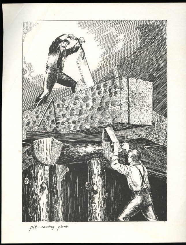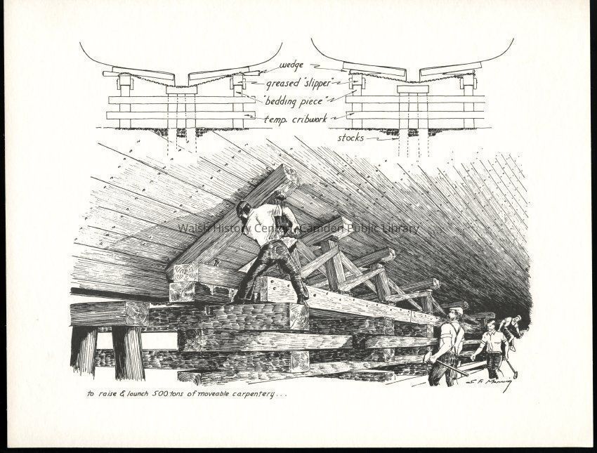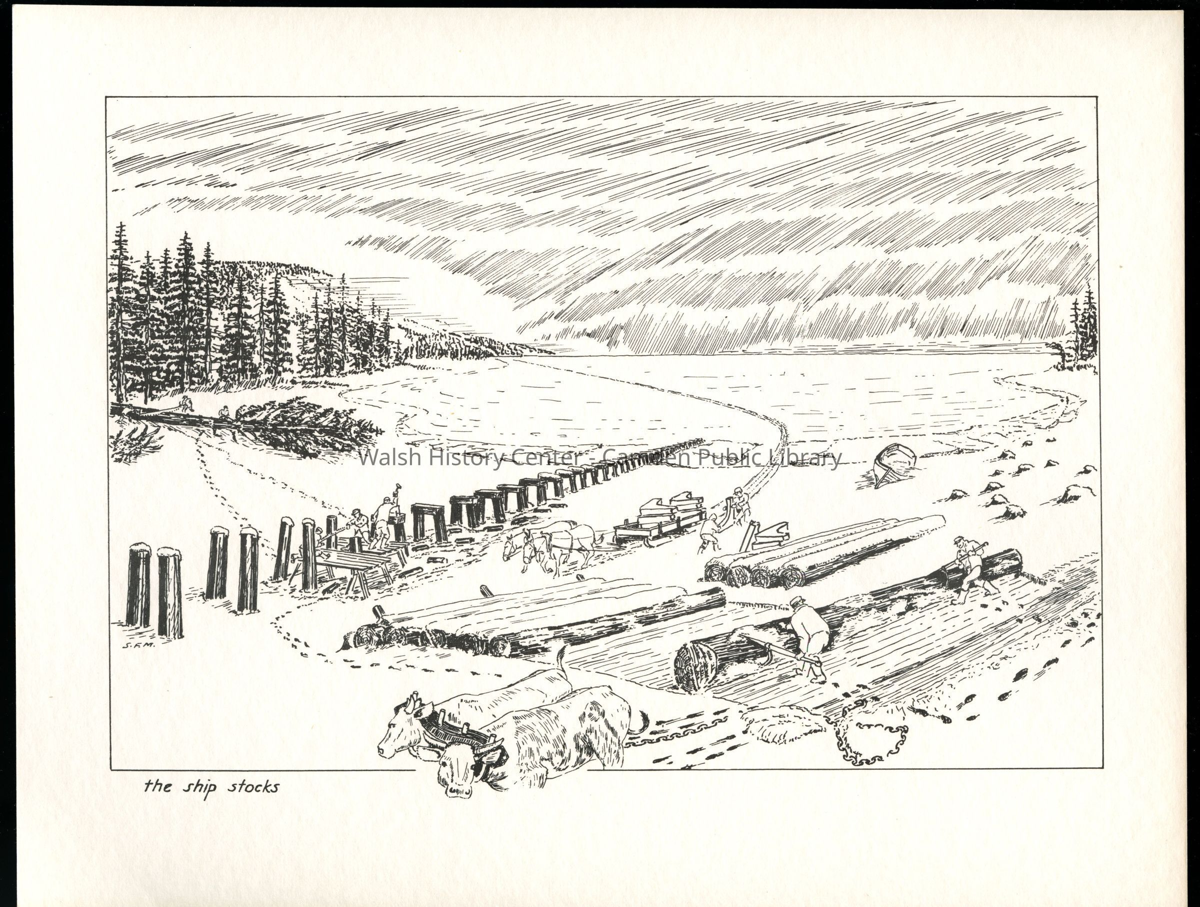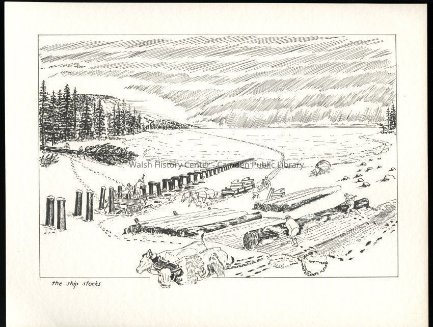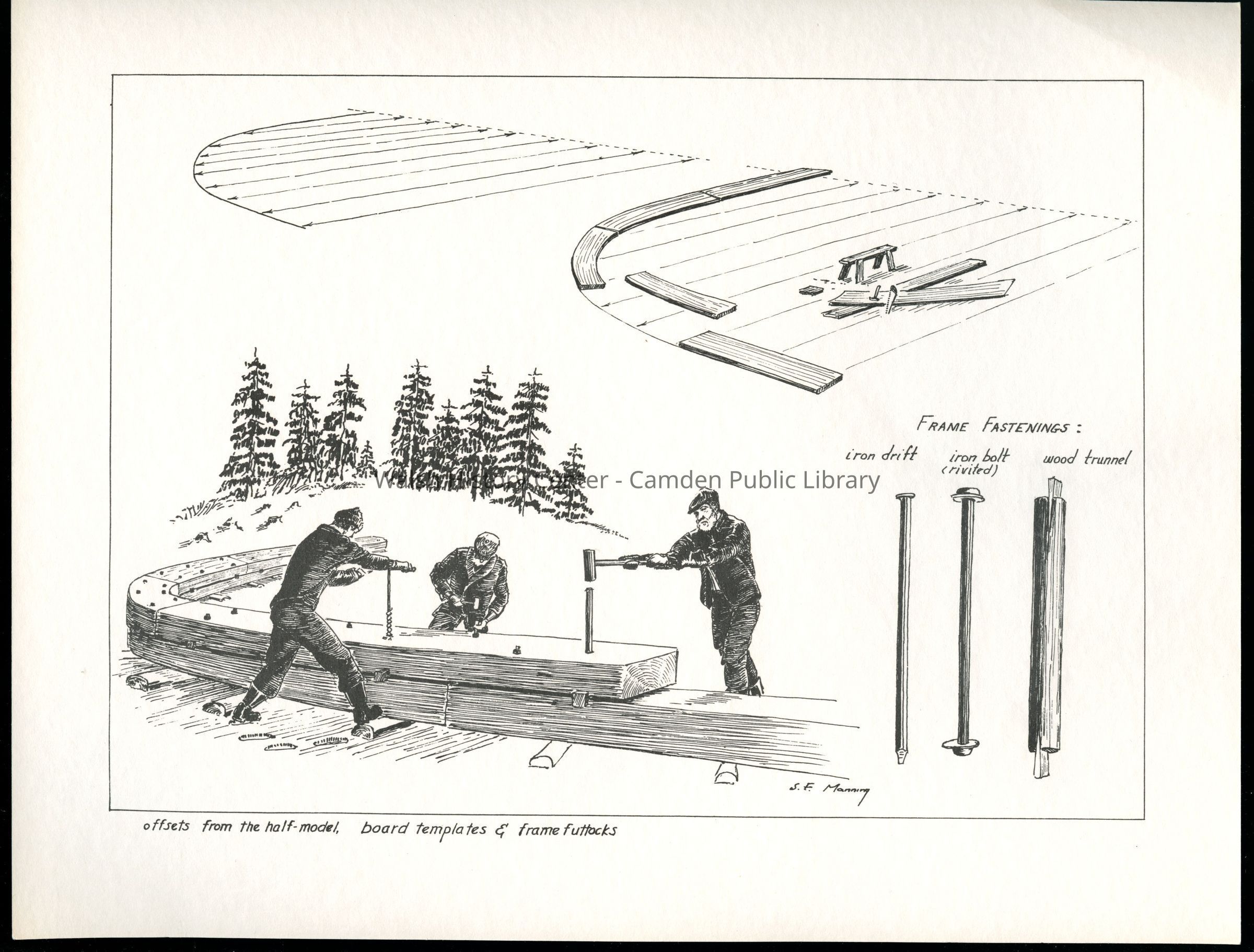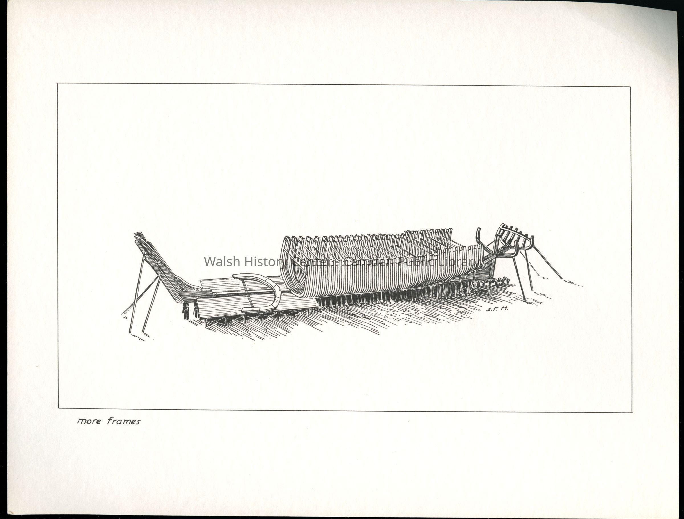 Set of loose 12 pen and ink drawings of the stages of construction of a schooner on the Maine coast by marine illustrator Samuel F. Manning. Each print is 8 1/2" x 11" on ivory cover stock.Collection